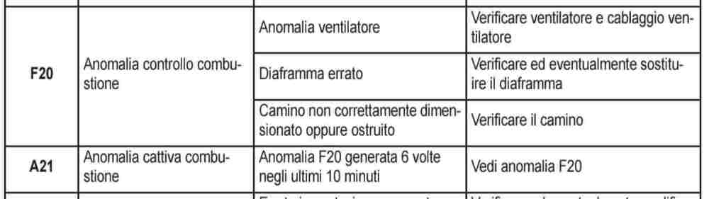 Buonasera a tutti, sono Domenico e sono nuovo del forum. Scrivo per provare a recuperare la suddetta caldaia, è stata un po' trascurata ma credo possa ancora andare bene. Ho da poco sostituito lo scambiatore dell'acqua sanitaria che purtroppo si era ostruito, ed ora l'acqua sanitaria funziona a meraviglia. Purtroppo continua a presentarsi l'errore A21 dopo aver acceso il riscaldamento (esce dopo una ventina di minuti circa, allego foto del manuale). Ho notato che all'inizio la condensa esce regolarmente poi non fa più condensa, ho anche smontato il recuperatore fumi che , a parte un po' di ruggine interna, sembra essere apposto. Vi ringrazio anticipatamente per eventuali risposte. Saluti Domenico -