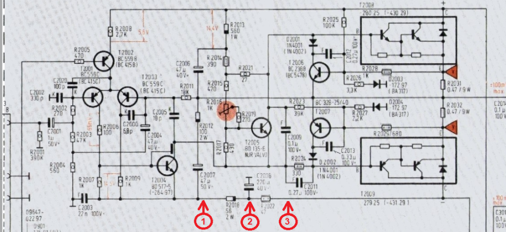 In via preliminare controlla le tensioni, puntale nero a massa, le tensioni presenti sui punti indicati sotto, sia sul canale funzionante che quello non funzionante. Inoltre misura anche la tensione presente nei punti contrassegnati dai triangoli rossi, su entrambi i canali -