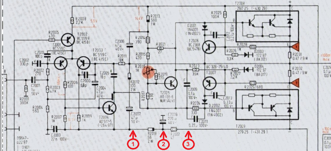 In via preliminare controlla le tensioni, puntale nero a massa, le tensioni presenti sui punti indicati sotto, sia sul canale funzionante che quello non funzionante. Inoltre misura anche la tensione presente nei punti contrassegnati dai triangoli rossi, su entrambi i canali