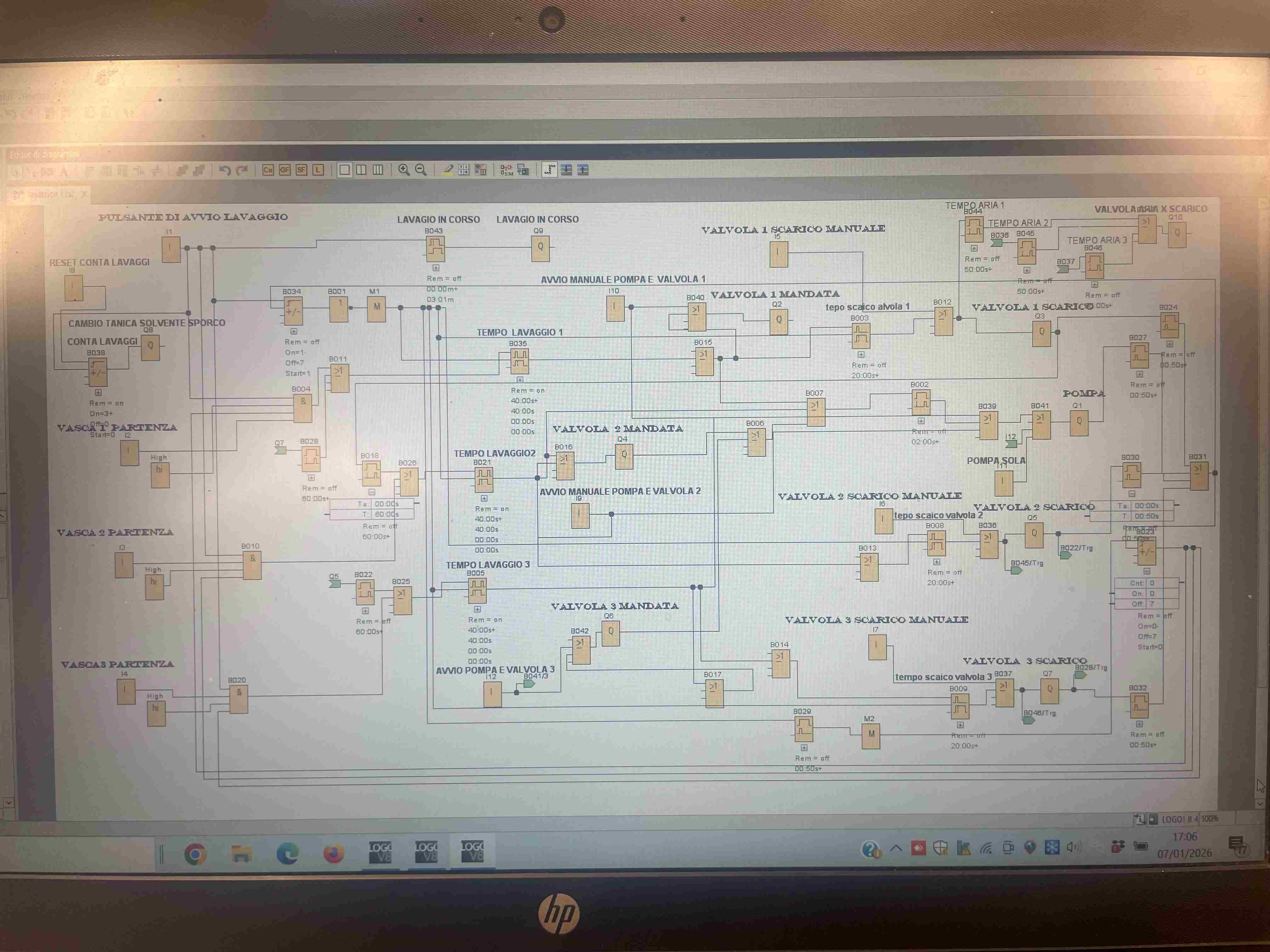Buona sera. ho un problema che non riesco ad individuare e risolvere anche se all'apparenza funziona tutto. Spiego il programma . ho una vasca con dei spruzzatori lavapezzi e 3 serbatoi- fustini contenenti il solvente a freddo ed ecologico. con un pulsante I1 faccio partire il ciclo di lavaggio. il pulsante I1 fa partire il ciclo di lavaggio con vasca n1 che apre una valvola di mandata Q2 valvola di scarico Q3 e pompa Q1 .La pompa aspira dalla vasca 1 il solvente ,lo spruzza nella vasca di lavaggio e ritorna nella vasca tramite la valvola di scarico Q3. Il tempo di lavaggio è regolato con interruttore comodo B35 che allo scadere fa chiudere la valvola di mandata e pompa . lo scarico Q3 avrà un tempo ritardato rispetto alla pompa per permettere di scaricare tutto il sovente all'interno della vasca. alla fine del lavaggio vasca1 ,si attiva una seconda vasca con valvola di mandata Q4 - valvola di scarico Q5 e sempre la stessa pompa Q1 il tempo regolato sempre con un interruttore comodo B21. anche in questo caso si aprirà la valvola di mandata insieme alla valvola di scarico e pompa , la valvola di scarico sarà spenta(chiusa) con un tempo di ritardo di 20 secondi per permettere di scaricare nella vasca n° 2 tutto il solvente . finito questo intervallo parte la vasca n° 3 nello stesso modo con valvola di mandata Q6 valvola di scarico Q7 e sempre la pompa Q1 al temine del ciclo si spenge tutto tramite il contatore avanti indietro B34 e B23. C'è anche un Q9 che non con una lampadina ed un aspiratore segnala tutto il ciclo di lavaggio completo dei tre settori . c'e anche un conta lavaggi Q8 che appunto conta i cicli di lavaggio impostabili con pulsante reset per avviare un nuovo conteggio. ho pensato in oltre che dopo tot lavaggi (nel mio caso circa 40) la prima vasca risulterà sporca , la seconda vasca sarà leggermente sporca e l'ultima vasca sarà e dovrà essere pulita se tutto funziona. A questo punto tolgo solo la prima vasca e la sostituisco con una vasca nuova (fusto) . Ho pensato di modificare la partenza del nuovo ciclo di lavaggio non dalla 1a vasca ma dalla seconda vasca ( leggermente sporca) che diventerà la prima, la terza vasca diventerà la seconda e la prima vasca di prima diventerà la terza ed ultima del ciclo . questo è possibile selezionando dei interruttori di precedenza I2 (ingressi 2) per la vasca (fusto) n°1 --I3 vasca 2 ed infine I4 vascan°3 selezionando l'interruttore su on I2 oppure I3 oppure I4 attivo la partenza con cui il ciclo parte . chiaramente gli altri devono essere su off . pertanto ogni 40 lavaggi la partenza cambierà da 1 ad 2 e dopo altri 40 lavaggi si cambierà la seconda e cosi via . Il problema riscontrato è questo. Parte tutto regolarmente scambia regolarmente la pompa si attiva regolarmente le valvole lo stesso funzionano , ma quando faccio partire i secondo ciclo cioè fatto un lavaggio intero lui si spenge pronto per essere premuto di nuovo con pulsante di avvio. IL ciclo non parte anche se il ciclo lo fa cioè partono i timer nella simulazione si accendono sia pompa che valvole in somma nella simulazione funziona tutto , ma in realtà non arriva corrente alle utenze.ma al ciclo successivo riparte tutto regolarmente e si completa regolarmente .praticamente funziona uno si ed uno no , 1-3-5-ecc funzionano glia altri no. La pompa è una trifase 380volts che viene attivata con un teleruttore con bobina da 24volts . le valvole sono a 24volts compreso il logo è a 24 volts . abbiamo una spina co 5 poli le tre fasi neutro e terra . con tre fasi si comanda un teleruttore per la pompa ed uno per aspiratore e lampada di segnalazione ciclo attivo il resto del circuito viene utilizzato il 24voltz del trasformatore simens. Il logo e unLogo 8 normale co scheda SD . Vi ringrazio Carlo -