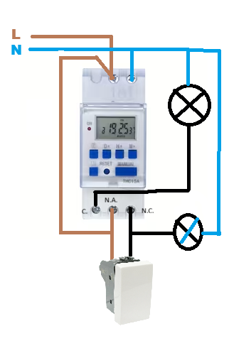 Se in Uscita il Timer ha 3 Morsetti : Comune, Normalmente aperto e Normalmente Chiuso ,è utile il seguente Schema : La Spia collegata al Morsetto N.C. segnala lo Stato dell' Interruttore, anche mentre il Timer sta alimentando la Lampada principale , per evitare di fare confusione con l' Interruttore, o eventuali Deviatori . Ovviamente la reale posizione dei Morsetti dipende da Marca e Modello del Timer . - Nel caso l' Uscita avesse solo 2 Morsetti , consiglierei un Interruttore Bipolare , che azionerebbe la Spia attraverso il suo 2° Contatto . - Buona giornata ! -