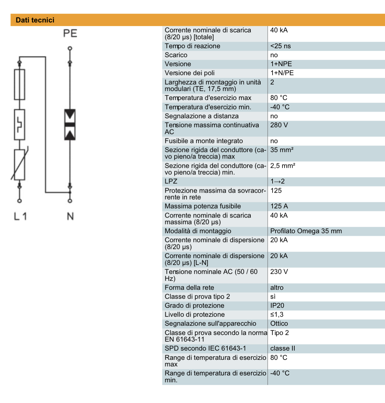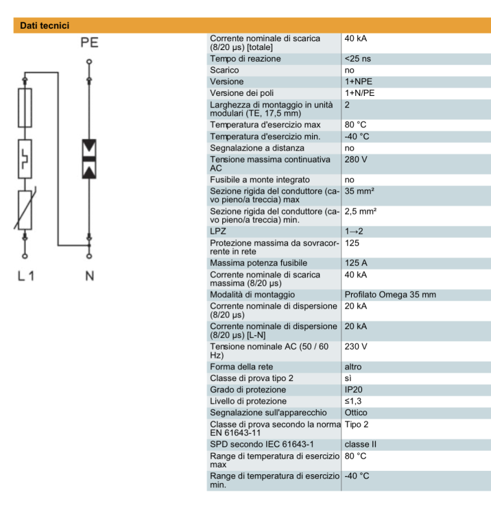 Buongiorno a tutti, ho acquistato un SPD OBO Bettermann V20-C 1+NPE e non riesco a capire dal manuale se necessita di fusibile a monte oppure no. Nello schema è segnato F1, mentre F2 è necessario solo se F1 > 125A. Io a monte di questo SPD ho un mt da 40A, non dovrebbe valere quello come protezione F1? Serve comunque un fusibile tra il mt e l’SPD? Grazie a tutti! p.s. allego anche la scheda tecnica -