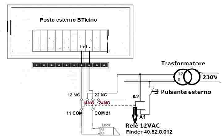 2. Ciao papa, Ti serve un trasformatore qualsiasi da 30-40VA - 230/12VAC ed un relè monostabile a 2 scambi tipo un Finder 40.52.8.012 con il relativo zoccolo 95.05: https://cdn.findernet.com/app/uploads/S40IT.pdf da collegare così: In pratica porti i fili della serratura ai morsetti COM-COM del relè (anzi dello zoccolo naturalmente), i due fili L+ e L- che escono dal posto esterno BTicino li colleghi ai morsetti NC-NC del relè ed i fili che escono dal trasformatore li colleghi ai morsetti NO-NO dello zoccolo. Poi la bobina del relè A1-A2 la colleghi direttamente all'uscita 12V del trasformatore interponendo il pulsante aggiuntivo come nello schema (altrimenti rimarrà sempre eccitata). Non badare tanto alla disposizione dei fili, considera lettere e numeri descritti e non badare nemmeno alla polarità perché tanto sei in Corrente alternata e problemi di questo tipo non ce ne sono. Facci sapere i risultati quando hai fatto