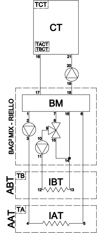 2. Come ho scritto l'impianto è questo. Davo per scontato che sarebbe stato necessario adottare una centralina a parte, in grado di pilotare sia i circolatori che la valvola. Più in dettaglio lo schema è quello che allego con indicati TA e TB rispettivamente i termostati per gli ambienti ad alta temperatura AAT e bassa temperatura ABT, e con TCT l'ingresso del termostato per la centrale termica che può essere regolata con le temperature TACT (35°) e TBCT (65-70°). La logica che ipotizzo è che se si seleziona TBCT la centralina reagisce solo a TB azionando la valvola a 3 vie ed il circolatore 10-11. Quando TB è chiuso si chiude TCT per azionate la CT ed il circolatore 10-11. La posizione della valvola dipende dalla temperatura rilevata nel braccio 9-10, se al di sotto di TBCT allora la valvola sarà nella posizione 8-9 altrimenti 9-15. Se la temperatura è settata su TACT, si mantiene la stessa logica di funzionamento per il circuito a bassa temperatura, mentre il termostato TA quando è chiuso, chiude a sua volta TCT e fa azionare il circolatore 2-3.