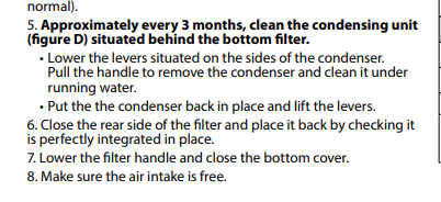 Nel manuale si vede chiaramente che ha il condensatore estraibile... e pure con filtro davanti. Dice proprio di estrarlo ogni tre mesi e metterlo sotto l'acqua. Più resistenza di così si muore. Ma dove l'acquisti? ...se non sono troppo indiscreto? PS: dovrai cambiare la spina, quella UK non è shuko. -