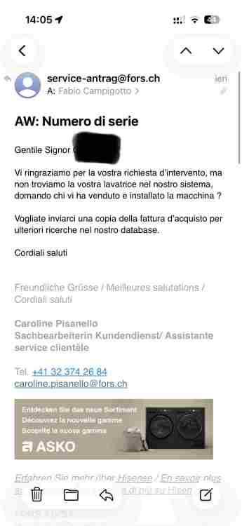 Il prezzo di listino in Svizzera è di CHF 3'290. Lo sconto me l'ha fatto in egual modo per entrambi i modelli che m'ha proposto. Molti brand non hanno sede in Svizzera e quindi i venditori terzi li acquistano dagli importatori ufficiali - in questo caso dalla Fors SA (SpA in Italia). Non mi è dato sapere se la lavatrice è stata sballata sul furgone, ma ci sono altre cose che non tornano. L'assistenza non reagisce (contattata martedì e ancora non ho appuntamenti). Ieri sera mi scrive questo: Poi oggi ho trovato il tubo per l'acqua calda che mi sono fatto lasciare (la mia Asko prevede un doppio allacciamento acqua fredda/calda se disponibile) e noto le condizioni dell'ottone: Qui non tornano molte cose. -
