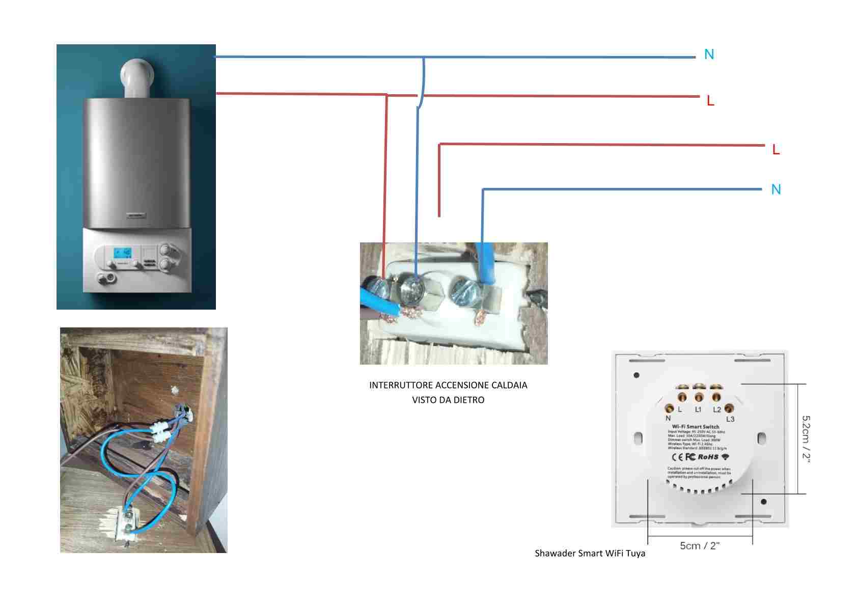 Buongiorno avrei bisogno di un aiuto, vorrei sostituire l'interruttore che attualmente comanda l'accensione della caldai con un interruttore wifi. provo ad allegare alcune immagini ed uno schemino. potreste indicarmi come dovrò collegare il nuovo interruttore. Grazie a tutti coloro che mi daranno un aiuto -