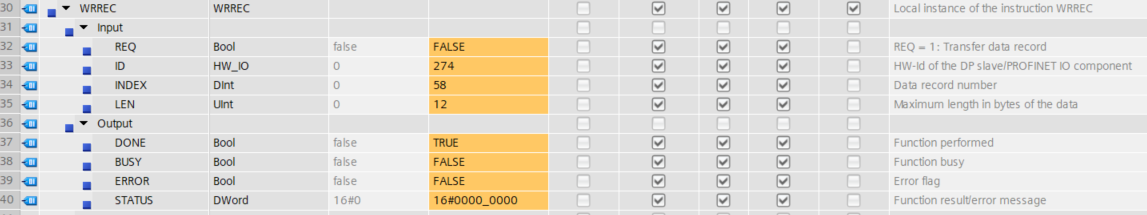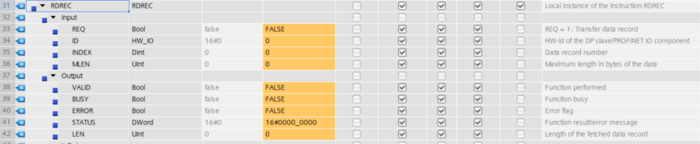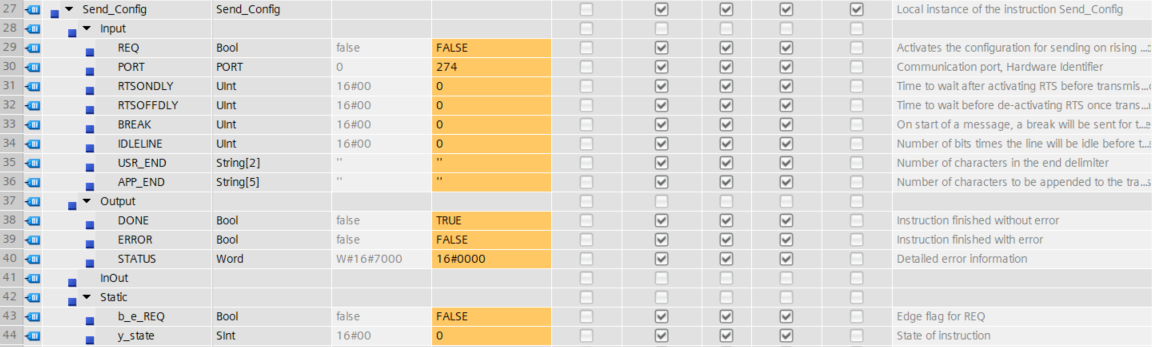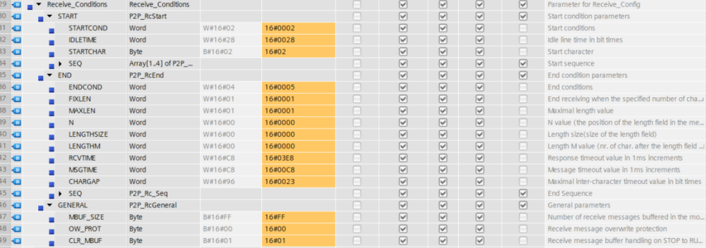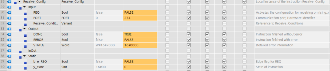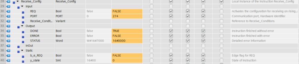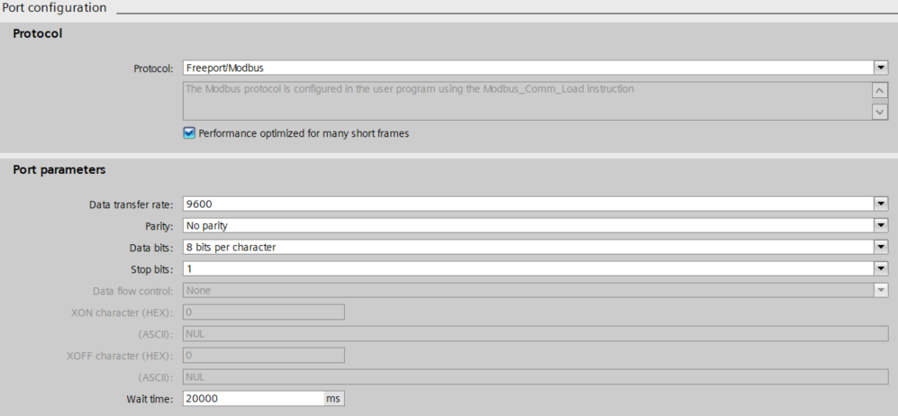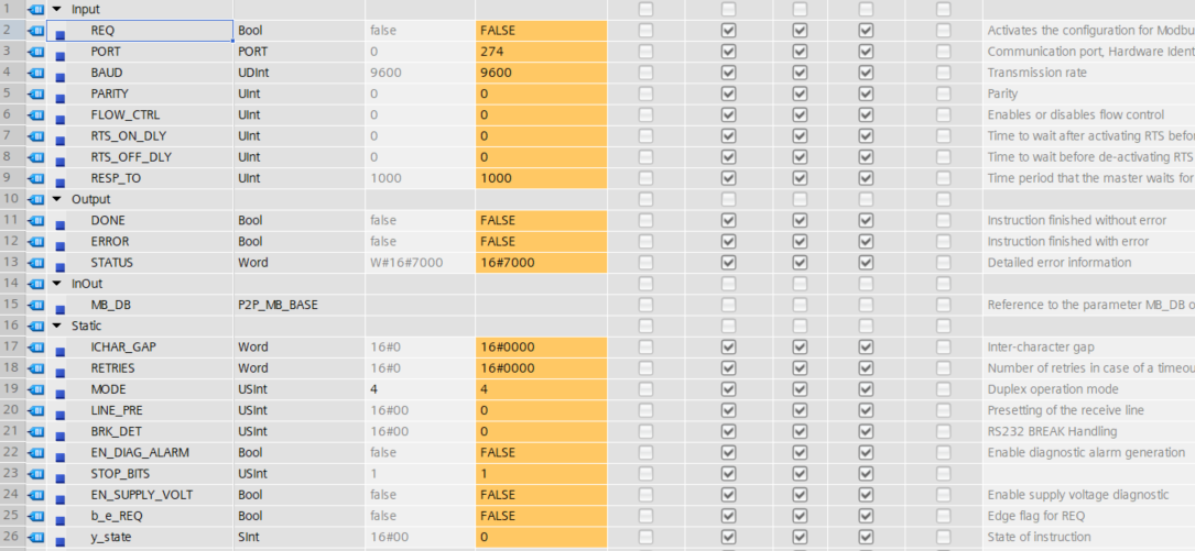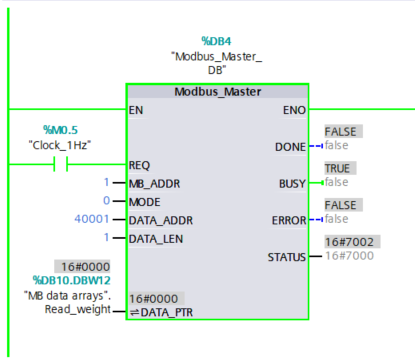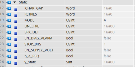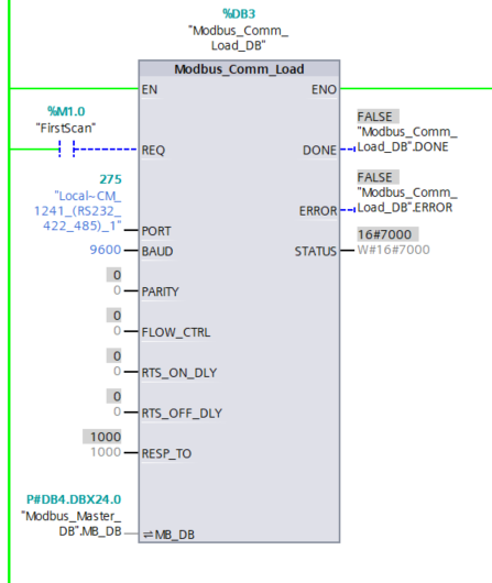 Buon giorno, Premetto che sono nuovo in questo campo e dopo settimane di tentativi mi ritrovo a scrivere qui per una disperata richiesta d'aiuto. Come da titolo sto cercando di creare una comunicazione Modbus RTU, il fine è semplicissimo: leggere informazioni da una batteria di sensori. Il sistema è composto semplicemente da: PLC S7-1200 G2, modulo di espansione ingressi e uscite analogiche SB1231 AI G2 e modulo di comunicazione CM1241 G2. L'ultimo modulo ha a disposizione la comunicazione RS 232/422/485 e come è facile intuire sto cercando di usare il Modbus RTU su RS485. Ho seguito qualsiasi guida, consiglio, letto e riletto l'Helper, ho aggiornato plc, modulo di comunicazione e TIA portal alle ultime versioni ma niente, rimango bloccato nello stato #7000 sia nel Comm_load che del Modbus_master. Il comportamento che ottengo è che il led TX del modulo CM lampeggia, quello RX non si accende mai, ho provato a collegare il Modbus al pc tramite un adattatore seriale e quando Modbus Poll ricerve qualcosa da parte del PLC avvisa che è arrivato un messaggio non compatibile con la comunicazione (9600 baud, 8 bit dati, 1 bit di stop, nessuna parità). Se potete vi chiedo gentilmente di seguirmi o farmi capire se ho tralasciato qualcosa, grazie. In allegato screen della configurazione e tabella online del Comm_load Configurazione dispositivo CM1241: Funzione Comm_load e configurazione variabili statiche: Configurazione funzione Modbus_master: Valori online Comm_load: Cablaggio connettore