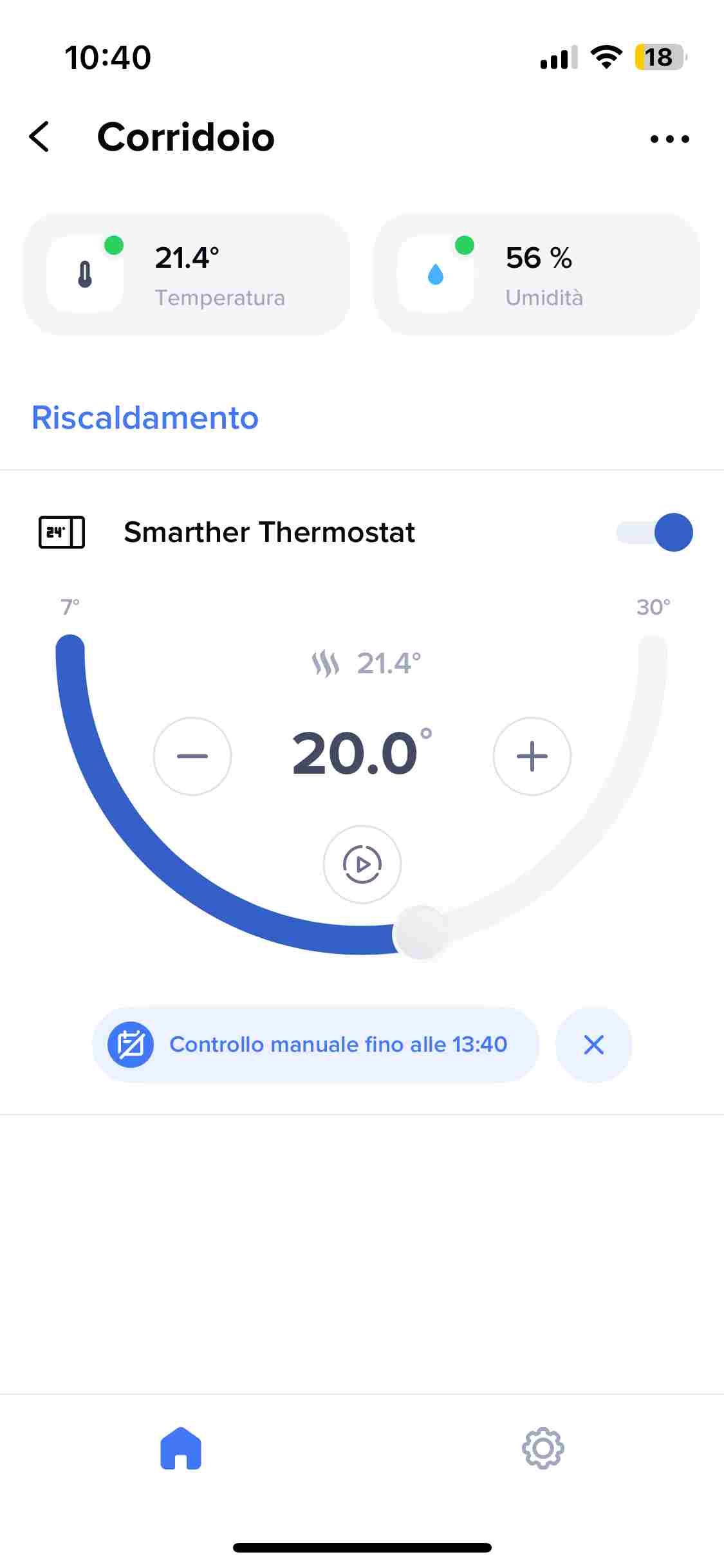 Si certo risolto grazie: in effetti il reset è stato più semplice di quanto temevo attraverso il pulsante in alto a destra (sul bordo esterno), ho fatto in circa 15 minuti. L'app Control per gestire Smarter Thermostat bTicino è la versione v. 4.8.0 (396): è noto è molto dettagliata, per le mie necessità anche troppo. Apprezzo l'eventuale impostazione manuale, per abbassare/alzare la temperatura in specifiche circosatanze, che si auto-imposta per 3 ore (modificabile) e al termine ritorna alla programmazione base (credo sia un funzione ormai diffusa in molti cronotermostati). In generale il sistema che ho installato in questa abitazione non è molto "smart" poiché questo cronotermostato non è associato alle valvole Netatmo sui termosifoni, che ho provato ad installare senza successo... Chiedo: in caso di assenza del segnale WiFi, la caldaia (collegata via cavo al cronotermostato) continuerà ad operare sulla base del programma impostato... o no? -