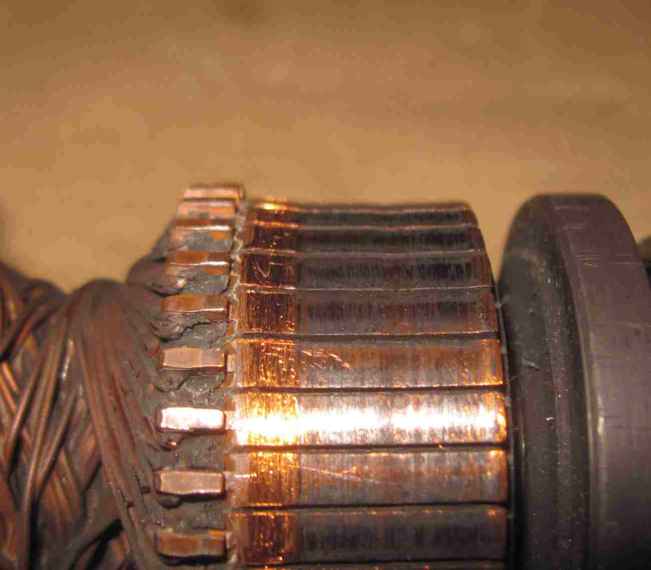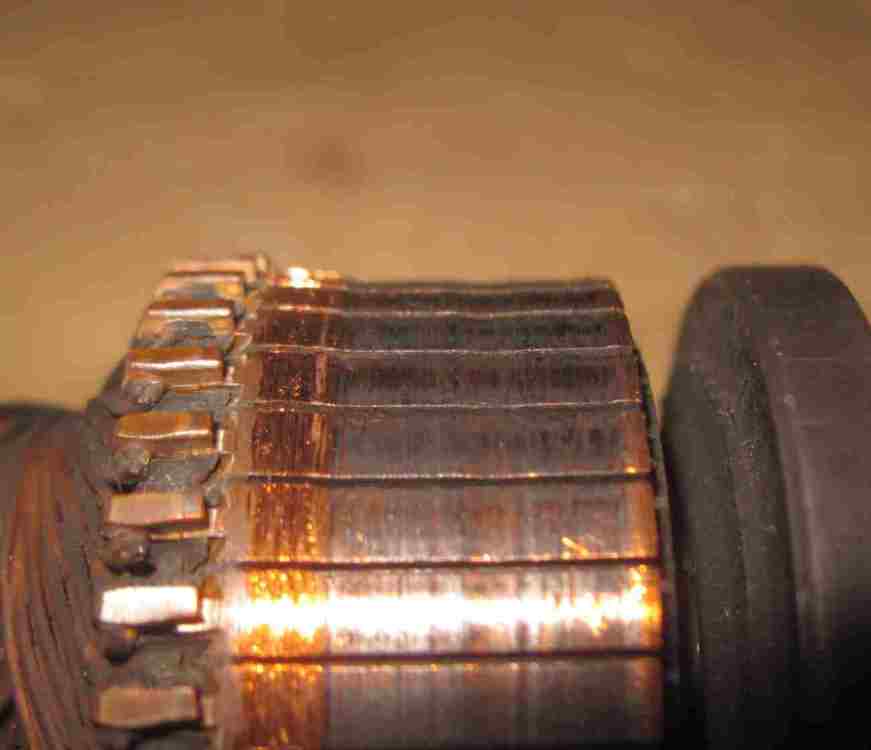 2. buonasera, possiedo una lavatrice Bosch WFF 1100 II, una grande macchina, che mi piacerebbe salvare anche stavolta, durante uno degli ultimi lavaggi ho avvertito nella stanza odore di parte elettrica riscaldata, capito che proveniva dalla lavatrice, ho toccato la lamiera dove dietro so c'è la scheda e ho trovato la zona insolitamente calda, anche l'acqua dall'oblò mi è sembrata ben calda, ho spento subito la lavatrice, arieggaiata la stanza, lo strano odore non si è ripresentato, ho poi smontato coperchio superiore e posteriore, ho messo in parallelo alla resistenza una piccola lampada spia, ed ho rifatto lo stesso programma di lavaggio con il quale avevo sentito lo strano odore, la resistenza veniva azionata correttamente, la lampada spia aiutava anche a sentire il rumore dell'acqua quando viene riscaldata, altrimenti difficile da avvertire, la temperatura acqua, misurata attarverso l'oblò con un termometro infrarossi, era sostanzialmente corretta rispetto i 40° impostati, dopo un po', però, è ricomparso lo stesso strano odore, con la macchina aperta diventava più facile localizzarne la provenienza, la zona era quella delle 2 elettrovalvole, misurandone la temperatura col termometro infrarossi, però, erano fredde, sono allora andato a vedere più in basso, sulla stessa verticale, ho misurato la chassis esterno del motore con il termometro, ho letto 60° C, ho fermato la lavatrice, ho tolto l'alimentazione elettrica, ho toccato il motore con la mano, non si riusciva tenerci le dita, ho smontato il motore, ho pulito con aria compressa la polvere residua delle spazzole, non ho visto zone dell'avvolgimento annerite o anche solo con colore diverso dal resto, ho carteggiato i contatti dell'indotto, ho pulito bene le zone di separazione tra un contatto e il successivo, carteggiato di nuovo con carta fine, soffiato via ogni residuo con aria compressa, ho dato una leggera carteggiata alle spazzole sui loro lati lunghi, per assicurare un buon scorrimento nel porta-spazzole, con una piccola lima a mezzaluna ho anche dato una sistemata alla zona di contatto delle spazzole, che appariva seghettata, ho rimontato il tutto, ho riprovato, problema, purtroppo, è rimasto tale e quale, ho rismontato il motore, ho misurato le resistenze sull'indotto, che ha 36 segmenti di contatto, girando in un senso a piacere, un contatto col suo vicino (chiamiamolo secondo) misura 0,2 ohm, proseguendo il giro nello stesso senso, il primo contatto con il terzo misura 0,3 ohm, con il quarto misura 0,4 ohm, alla via così fino al suo opposto (il 18esimo) con cui misura 1,8 ohm, proseguendo il giro i valori scendono progressivamente con identico passo, fino a ritornare a 0,2 ohm con il segmento vicino sull'altro lato del giro (il 36esimo), ho poi misurato ogni segmento con l'alberino centrale dell'indotto, ho sempre letto 0 ohm, ho quindi misurato la resistenza del campo esterno, tra i soli 2 contatti che portano corrente al campo ho misurato 1,6 ohm, seguono foto di quanto trovato dopo revisione motore e successivo mezzo lavaggio di test, le spazzole (non originali, montate però già da qualche mese): la zona contatti dell'indotto (non ripulita): il profilo dei contatti dell'indotto (non perfetto, vedi avvallamento nella zona centrale): il campo esterno coi suoi 2 contatti: non sono forte in motori elettrici, quindi mi viene il dubbio che il non perfetto profilo dei segmenti sull'indotto possa peggiorare il contatto e provocare riscaldamento, mi viene anche il dubbio se il problema possa essere originato dalle spazzole non originali, non ho ancora smontato la scheda, prima di farlo volevo verificare i miei dubbi con l'esperienza che magari qualcuno ha avuto, grazie Gianluca Ancona