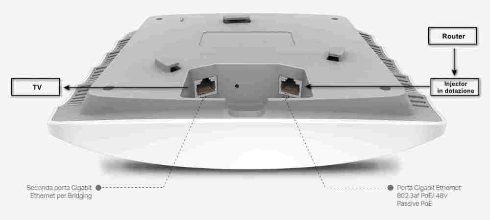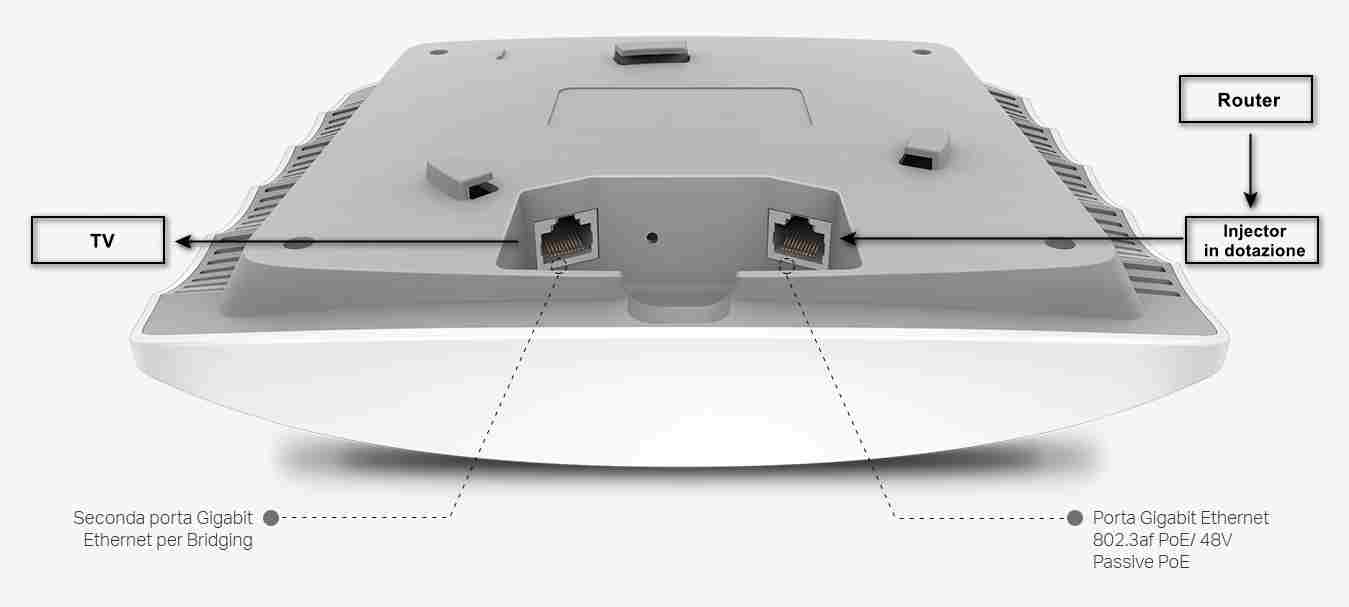 Forse però ho trovato la quadra. Sul sito della TP-Link ho trovato questo access point EAP245 | Access Point Indoor MU-MIMO Wi-Fi AC1750 | TP-Link Italia Però mi chiedo (e ho chiesto anche al servizio clienti, ma non ho ancora ricevuto risposta): 1) il "PoE Adapter incluso nella confezione" è un Poe Injector? 2) l'altra porta Gigabit, trasmette anche i dati o solo un "Pass through" per il PoE? Perchè se le due risposte fossero affermative, potrei installarlo in camera da letto così: -