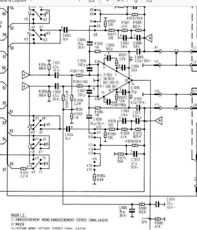 Volevo innanzitutto salutare e ringraziare tutti coloro che partecipano a questo forum. Sono un mediocre dilettante appassionato di elettronica in pensione che dopo circa 40 anni di software riscopre il piacere di un ritorno alle origini che ebbero inizio nel lontano 1983 come tecnico hardware in Philips. Il mondo in questo settore è totalmente cambiato e dato che la passione deve essere anche un piacere mi sto cimentando in piccole riparazioni di vecchi e gloriosi amplificatori HiFi degli anni 70-80 che nulla hanno a che fare con le tecnologie odierne. La questione che volevo sottoporre al gentile forum riguarda un receiver Grundig R25 che improvvisamente ha perso potenza e qualità in termini di distorsione. Facendo riferimento alla porzione di schema caricato che descrive la parte circuitale del preamplificatore, mi sono accorto che piuttosto dei 16,5V sul nodo su cui si attesta R1059 misuro meno di 12V come se al partitore R1059 ed R1081 fosse aggiunto un carico nascosto. Ho controllato le resistenze e 'recappato' l'intera zona degli elettrolitici al tantalio , staccando le due resistenze R1057 ed R1058 il problema persiste. Tutte gli altri voltaggi sono corretti compreso i 32V e i 16V che approdano ai piedini 1,13 e 14 dell SN76131. La cosa strana che il valore dei 12 V viene raggiunto gradatamente. Se gentilmente qualche persona più esperta di me può darmi una mano. Grazie -