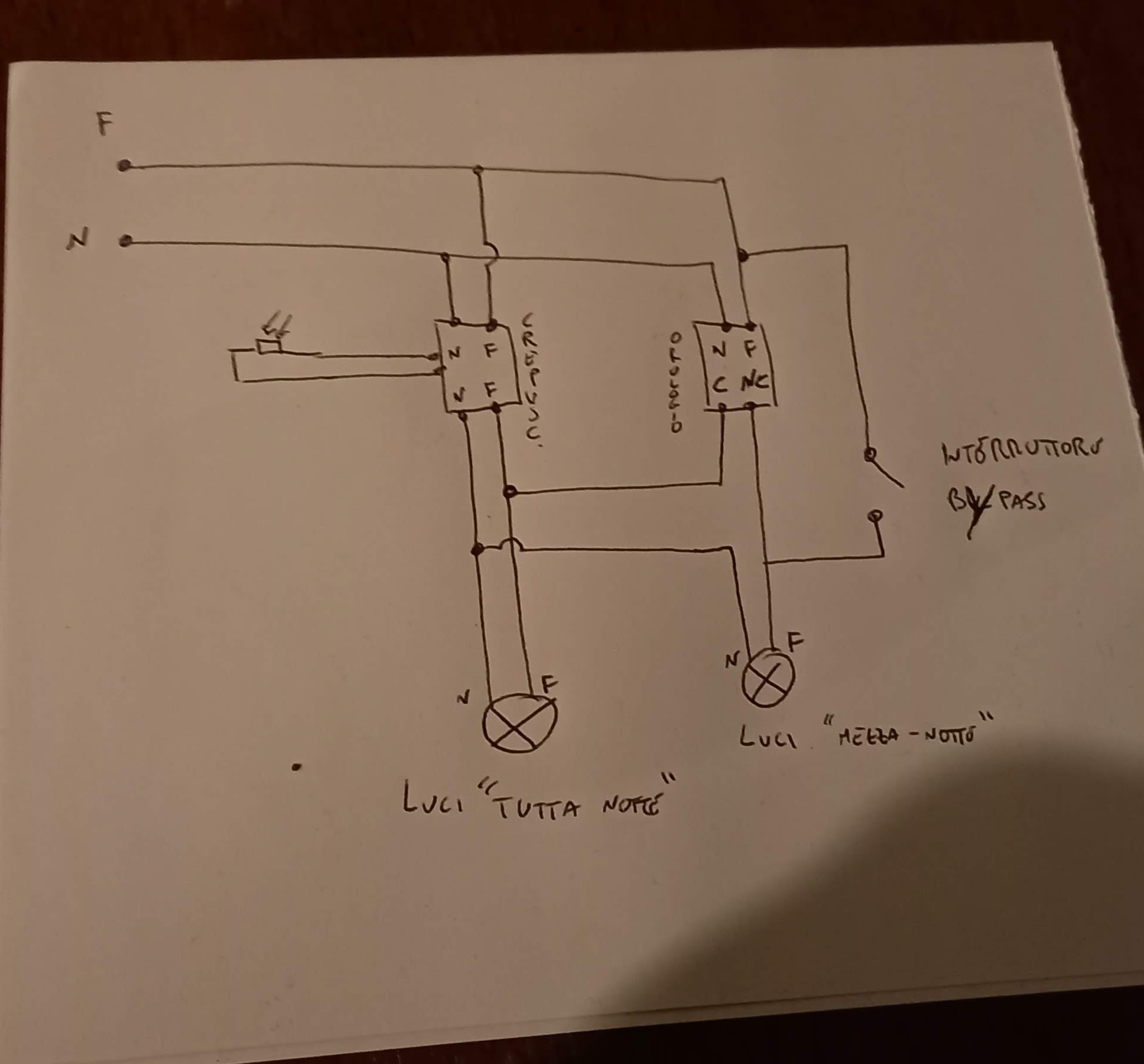 Fede11046 Inserita: 30 marzo 2021 Segnala Inserita: 30 marzo 2021 4 ore fa, Francesco 2 scrisse: Ma che tu sappia, devo acquistarli singolarmente, o li vendono accoppiati? scusa la mia ignoranza. E sono a modulo din. La sonda del crepuscolare la faccio uscire in alto dall'intonaco lontana dalle luci artificiali. Sono due cose separate, uno e il crepuscolare con sonda esterna e l'altro e l'orologio, ti consiglio di acquistarli online sul famoso e-commerce, risparmi molto e vanno benissimo. Solitamente l'orologio se digitale è a 2 moduli din mentre il crepuscolare può essere da 1 o da 2. 4 ore fa, Francesco 2 scrisse: L'interruttore aggiuntivo per accendere tutto, in caso di rumore sospetto, devo collegarlo in parallelo al circuito del crepuscolare e dell'orologio? Ti metto lo schema in allegato ma comunque lo userei solo per quelle luci che si accendono solo "mezza notte" le altre rimanendo accese tutta la notte è inutile gestirle anche da interruttore, nulla però ti vieta di farlo. 4 ore fa, Francesco 2 scrisse: A questo punto, il collegamento che avevo previsto dal cancelletto del terreno alla porta di ingresso casa (25 mt) , costituito da due deviatori, per l'illuminazione del vialetto centrale lo includo nella linea del giro dei vari pozzetti attorno casa collegati al crepuscolare? Cosa ne pensi? O forse sarebbe meglio separare comunque le due cose e accendere manualmente il vialetto e la lampada sopra un pilastro del cancelletto in ogni caso collegarla a uno dei crepuscolari ? Io personalmente preferisco averli sotto crepuscolare, sicuramente quello del cancelletto anche perchè illumina la zona del citofono, cosa da non sottovalutare. E anche quello dell'ingresso lo terrei sotto crepuscolare. 4 ore fa, Francesco 2 scrisse: Si, i faretti per la facciata, si è quella principale, si, li metterei e vanno messi con un'altra coppia di orologio + crepuscolare e li faccio con le derivazioni interne o incassate in facciata. Fai arrivare un corrugato al centralino o a alla cassetta sotto centralino se prevista e li terrei sotto lo stesso orologio del quadro, per semplicità. 4 ore fa, Francesco 2 scrisse: Le applique li devo mettere sopra le porte finestre e l'uscita della lavanderia comandati da un interruttore con led spia, per le altre pareti esterne mi consigli quindi di non mettere nulla visto che ci sono i lampioni attorno. Giusto? Si io direi che bastano quelli, per il resto ci sono i lampioni intorno alla casa. Discorso diverso se vuoi invece comandare gli applique da orologio allora li metti su tutte le facciate ma eviterei tenendo solo quelli sull'ingresso e questi comandabili con interruttore. Troppe luci danno fastidio a te e agli eventuali vicini, non te li dimenticare. In ogni caso questo è lo schema, ho utilizzato un crepuscolare che ha l'uscita fase-neutro. Altri hanno il contatto pulito (tipo l'orologio) ma il discorso è lo stesso. Il crepuscolare da il consenso, l'orologio lo imposti in accensione anche alle 14 (tanto per esagerare) che fino a quando non arriva la fase del crepuscolare comunque non accende i faretti, a un certo orario spegne parte dei faretti. L'interruttore come dicevo prima l'ho previsto solo sulle luci con orologio visto che le altre saranno sempre accese. Spoiler Ricordati solo che il tutto deve essere sotto lo stesso differenziale, in particolare la fase dell'interruttore. Esternamente mi raccomando di utilizzare l' FG16 come cavo e non il Fror, se lo metti in una guaina spiralata è meglio se no è prevista anche la posa interrata diretta con certe precauzioni.