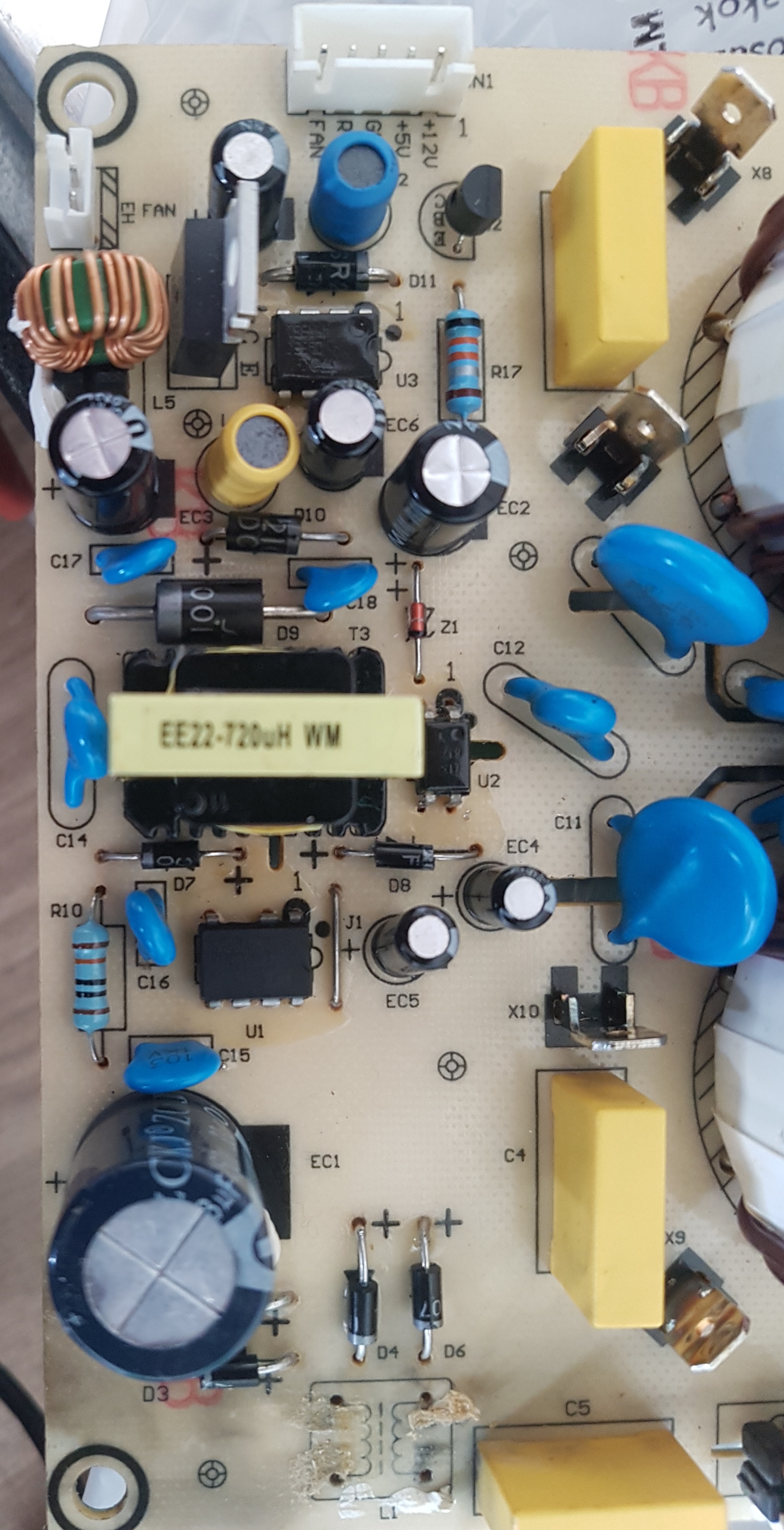 konseland Inserita: 29 aprile 2021 Autore Segnala Inserita: 29 aprile 2021 ciao a tutti! oggi con il tester ho fatto delle prove e, dopo aver cambiato il diodo in D9 trovo delle tensioni in continua in uscita! in particolare sull'uscita dei 12v trovo tra i 4,5 e i 2,5... sull'uscita 5v ho trovato talvolta 0,5 e altre volte 0... mentre sull'uscita della ventola non ho trovato nulla. allora per prima cosa ho visto che la corrente alternata, collegata a un impianto di cantiere, mi arriva a 195 volt... potrebbe essere quello il problema anche se all'ingresso del trasformatore mi arrivano circa 295v in continua? grazie a tutti! @DavidOne71 sui due condensatori che mi hai chiesto, su uno ho circa 8,5volt... sull'altro 4,5v