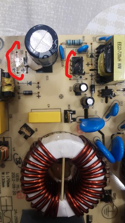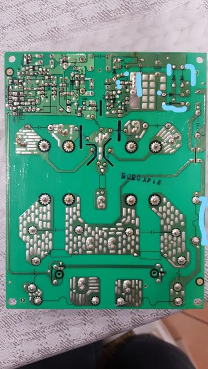DavidOne71 Inserita: 19 aprile 2021 Segnala Inserita: 19 aprile 2021 47 minuti fa, konseland scrisse: cercando bene mi sono accorto che il diodo posizionato tra i due cerchi bianchi che hai fatto tu sulla foto (si vede il simbolo stampato) i due cerchi che ho fatto, dovrebbero essere i reofori dei due condensatori EC2 ed EC3 50 minuti fa, konseland scrisse: é rotto... é un diodo schottky dovrebbe essere D9 o D10 che servono per raddrizzare la corrente di uscita dei due secondari e livellata da EC2 ed EC3 53 minuti fa, konseland scrisse: Potrebbe essere quello il colpevole di tutto? potrebbe 55 minuti fa, konseland scrisse: la devo misurare in continua su EC2 ed EC3, si l'alternata che esce dal trafo è ad alta frequenza (sopra i 100khz), non penso che un multimetro riesca a misurarla