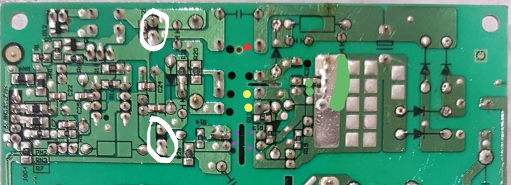 konseland Inserita: 18 aprile 2021 Autore Segnala Inserita: 18 aprile 2021 Salve a tutti! Sono riuscito a sostituire tutti i pezzi rotti (sul toroidale filtro ho fatto un ponte per ora) e ho sostituito l'integrato esploso... adesso mi trovo una situazione curiosa... Praticamente, all'ingresso del trasformatore EE22 ho i 320 volt... tranne su un piedino, ovvero il gate dell'integrato sostituito (tny180pn, in foto il pin con il punto nero vicino a quelli verdi)... nella figura allegata il punto rosso é il positivo, quelli gialli sono quelli che misurandoli insieme a quello rosso danno 320 volt, mentre il nero é quello collegato al piedino Gate che non ha corrente (é normale? Devo dire che l'ho provato senza alcun carico). La cosa curiosa é che all'ingresso del trasformatore ho le tensioni... in uscita zero totale... Ovviamente, la prima cosa a cui ho pensato é che fosse rotto il trasformatore EE22... Poi ho pensato che c'é anche un fotoaccoppiatore accanto (puntini viola sulla foto) che potrebbe essersi rotto... la rottura del fotoaccoppiatore può inibire la tensione in uscita del trasformatore? O comunque... può inibire la corrente nel piedino Gate dell'integrato? Mi sto studiando tutto quello che trovo... però per questo avrei bisogno del vostro aiuto... potete aiutarmi a capire se, oltre al trasformatore rotto, esistono altri motivi per cui potrei non avere tensione in uscita? Grazie mille!
