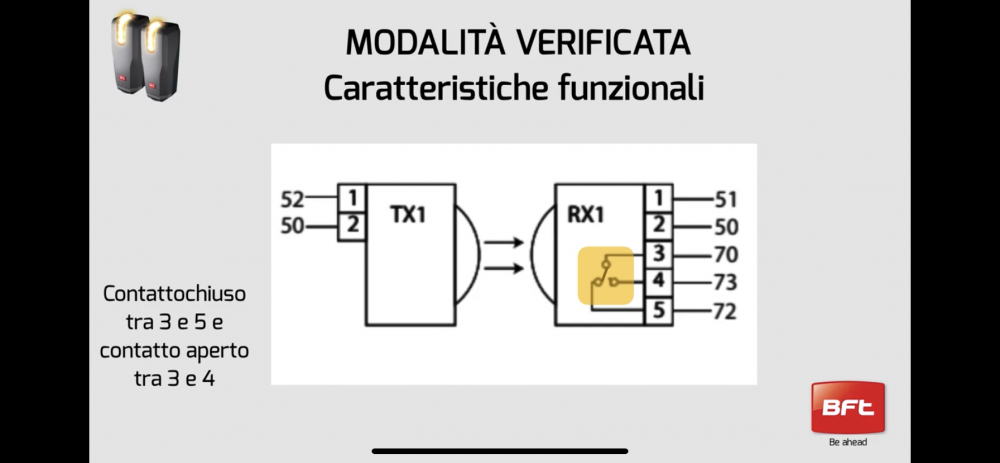ROBY 73 Inserita: 28 aprile 2021 Segnala Inserita: 28 aprile 2021 Ciao Lucab73, 10 ore fa, Lucab73 scrisse: ho installato un motore bft Deimos A 400 scorrevole con fotocellule lampeggianti. Prima di tutto per non perdere tempo inutilmente, è un DEIMOS ULTRA BT A 400 con scheda MERAK: https://bft.lt/Manuals/BFT_Deimos_Ultra_BT_A400_A600_EN_DE_IT_FR_SP_NL.pdf Oppure un DEIMOS BT A 400 con scheda HAMAL: https://bft.lt/Manuals/BFT_Deimos_BT_A400_A600_EN_DE_IT_FR_SP_NL.pdf Inoltre le fotocellule sono le THEA, si ma quali di preciso? https://www.bft-automation.com/it_IT/prodotto/thea-a15-opf-uni-1/ https://www.bft-automation.com/it_IT/prodotto/thea-a15-opf-1/ E soprattutto: 10 ore fa, Lucab73 scrisse: Le fotocellule sono solo due e installate in modalità non verificata. Funziona tutto bene tranne che le fotoc. Lampeggiano sempre Come e dove le hai collegate di preciso, su quali morsetti?