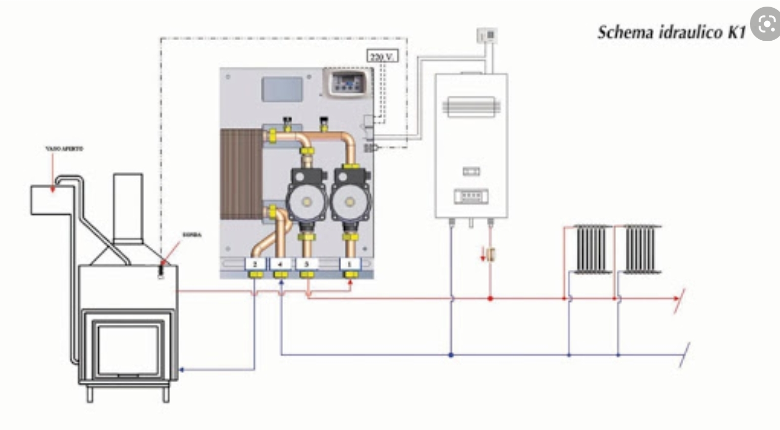 Stefano Dalmo Inserita: 13 maggio 2021 Segnala Inserita: 13 maggio 2021 Ci sono molti modi di fare lo stesso impianto , molto dipende dallo spazio a disposizione per il montaggio dei vari accessori . Per cui gli accessori sono sempre quelli , ma uno può nei limiti scegliere dove posizionarli . Seguiamo una cosa per volta e vediamo se riesci a focalizzare cosa realizzare per arrivare al tuo scopo , ora ti mostro solo lo schema del circuito di riscaldamento tra termocamino a vaso aperto e caldaia . Per il sanitario vediamo dopo altrimenti diventa complesso . Dove non capisci ,chiedi .