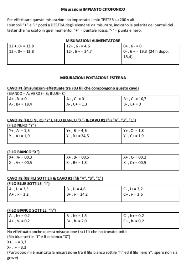 Rod War Inserita: 23 maggio 2021 Autore Segnala Inserita: 23 maggio 2021 il 22/5/2021 at 17:43 , ROBY 73 scrisse: Sì esatto, intendevo che hai fatto le cose correttamente Venendo alle tue misure non so dove tu abbia trovato i morsetti 12- / 12+ e 0- / 0+, se è come penso io dovresti avere solo i morsetti 12, 0, -6, +6, 18, J, giusto? Casomai posta un paio di foto dell'alimentatore e anche del posto esterno (inteso come microfono parla / ascolta) se ce l'hai, che ci capiamo meglio Poi il tuo cavo #2 con i fili bianco X e nero Y dovrebbe essere quello che va alla serratura sul cancello, controlla se è così. Il cavo #1 non ho idea a cosa possa servire, mentre il #3 è quello che in qualche modo dovrebbe andare all'alimentatore. A questo punto ti conviene lasciar perdere le misure della tensione che ti servono poco o niente in questo momento, prima di tutto togli tensione all'alimentatore e scolleghi tutti i fili dall'alimentatore e se hai una matassa di filo che è lunga e ti arriva dall'alimentatore al posto esterno la "getti per terra" e la usi come prolunga di un puntale del tester e mettendolo in funzione Continuità (Ohm) con la scala più bassa possibile (o cicalino se ce l'ha) e quindi batterti / testare un filo alla volta e capire quanti e quali fili sono ancora integri. Una volta trovati tutti puoi seguire lo schema che dovrebbe essere quello base nel link che ti ho postato ieri, magari trovi anche cosa fa il cavo #1 a 3 fili. Ciao Roby 73, innanzitutto ancora grazie della tua disponibilità! A) Prima questione: "...dovresti avere solo i morsetti 12, 0, -6, +6, 18, J, giusto?..." Proprio così. Sul alimentatore c'è un ponte tra lo 0 ed il -6, è per questo che ho considerato soltanto uno dei due chiamandolo sempre "0" (spero di aver dedotto bene) Seconda questione, nel foglio delle misurazioni i segni "+" e "-" posti subito dopo gli "elementi da misurare" indicano IL PUNTALE DEL TESTER CHE HO USATO, PUNTALE ROSSO ("+"); PUNTALE NERO ("-") Per esempio, misurando 12 con lo 0: IL PUNTALE ROSSO ("+") sul 12; IL PUNTALE NERO ("-") sullo 0 ======== OSSIA: 12+ , 0- = 13,8 invece: IL PUNTALE NERO ("-") sul 12v alt ed il IL PUNTALE ROSSO ("+") sullo 0 ===OSSIA: 12- , 0+ = 13,8 (In questo caso i due valori sono uguali) E così per tutte le altre misurazioni... C) Roby 73, credevo che controllando la tensione sui fili della postazione esterna si poteva arrivare a dedurre quali fili portavano 12, 6 e 0, di modo che potesse collegare il parla ascolta correttamente... 😞 D) Ho fatto le mie deduzioni, sulla base di queste misurazioni e del fatto che la chiamata dei citofoni interni funzionano bene (quando dalla pulsantiera esterna si chiamano i diversi appartamenti). Funziona bene anche l'apertura del cancello dai citofoni interni (non abbiamo altri pulsanti per aprire il cancello). Non funzionava il parla ascolta perche troppo vecchio... Ho acquistato uno nuovo: URMET 1145... che però non so come collegare dato che ci sono tanti fili e non saprei quale porta 12, 6, 0... Gentilmente, posso dirti le mie deduzioni? Allego fotografie ALIMENTATORE, parla ascolta nuovo URMET 1145. Grazie mille della pazienza. Rod