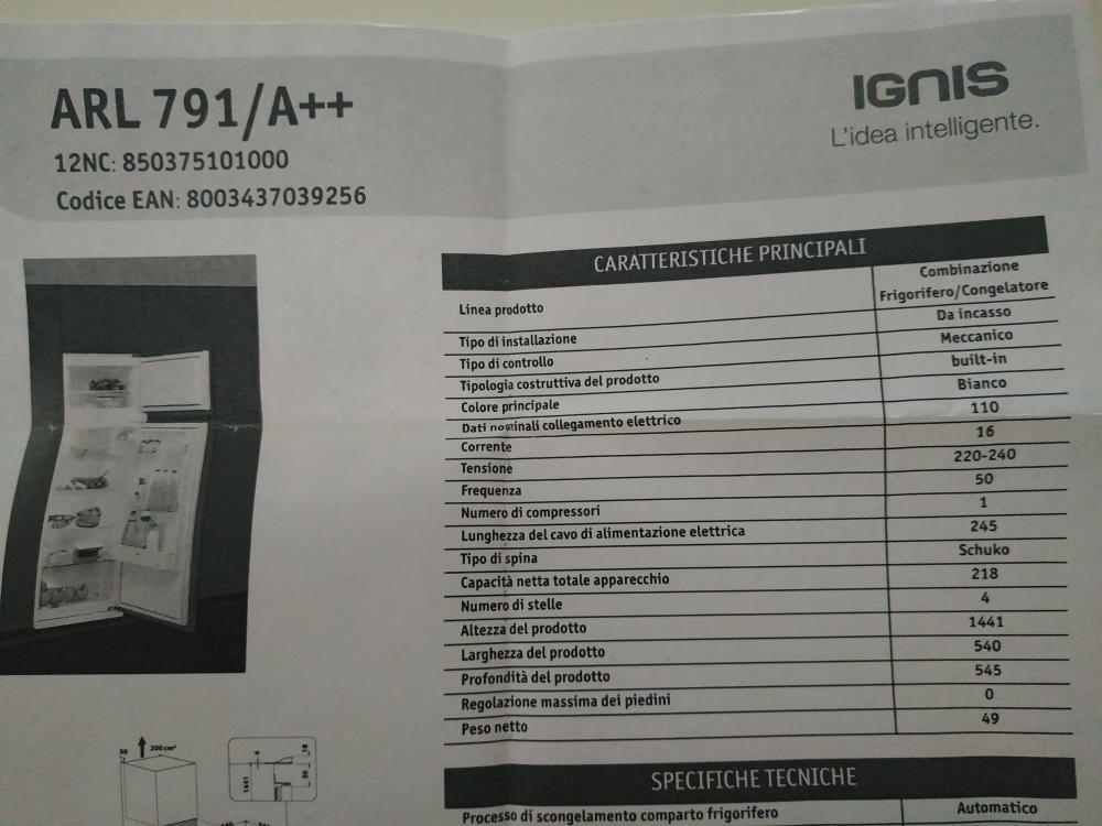 junglar Inserito: 9 agosto 2021 Segnala Inserito: 9 agosto 2021 Salve, ho un vecchio frigo indesit modello IN-D 240 G.1 SX/1 è giunto il momento di cambiarlo, voglio comprare un nuovo frigo ad incasso, ma non vorrei sbagliare con le misure... Ecco quali misure ho preso: 1 metro e 58,5 cm (è l'altezza del frigo presa da terra, quindi inclusi i piedini) 1 metro e 46,3 cm (altezza del frigo esclusi i piedini, quindi fino a quella guarnizione nera di gomma) 1 metro e 2 cm è l'altezza solo della porta del frigo 1,7 cm interspazio tra la porta frigo e il freezer 36 cm solo l'altezza del freezer Riguardo le due ante di legno, quella superiore è inutile misurarla perché è molto alta e copre ampiamente il frigo. Invece l'ante di legno inferiore è alta 1 metro e 9,5cm l'interspazio tra le due ante è 1 cm. Oltre all'altezza del frigo e l'altezza dell'ante di legno, quali altre misure servono? I piedini del frigo misurano circa 12 cm, posso ipotizzare che siano estensibili, quindi non vanno calcolati, e la misura reale del frigo dovrebbe essere 1metro e 46cm... devo comprare un qualsiasi frigo da 1 metro e 44cm? Oppure devo stare attento e tener conto di altri parametri? I frigoriferi moderni hanno piedini estensibili di oltre 10 cm? Se compro il frigo da 144 cm e poi non ha i piedini estensibili sono nei casini :D Ho adocchiato questo frigo: Ignis Arl 791/A++ Ho allegato 1 foto del frigo vecchio, e 2 foto del frigo che potrebbe interessarmi con le relative misure. Me lo consigliate oppure è meglio comprare altro? Ma soprattutto vorrei capire le misure, per non commettere errori nella scelta.