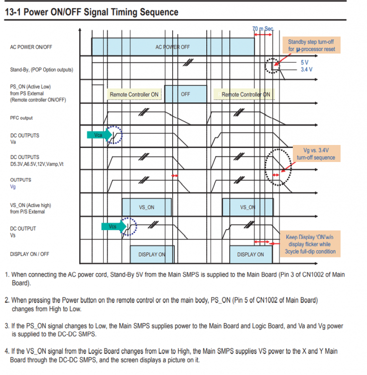Riccardo Ottaviucci Inserita: 2 febbraio 2022 Autore Segnala Inserita: 2 febbraio 2022 (modificato) 3 ore fa, Badciaps ha scritto: rimpiazzalo con uno sano da 5v, l'avevo già fatto all'inizio dell'intervento e prima di modificare il feedback della Vstby ma era in modo volante e mi sembra che l'intervento della protezione ci fosse ancora. Riproverò in modo più stabile. 3 ore fa, Badciaps ha scritto: la regolazione del trimmer spero che hai segnato la pos. originale come penso vada sempre fatto, e lo rimetti com'era, ovvio La Vcc che alimenta il relè di accensione c'è , fa partire il PFC che a sua volta dà potenza al generatore della Vs che viene generata dal consenso di U804 ,sempre innescata dalla Vcc o meglio dalla Vcc-S generata dopo altri consensi. La partenza di questo TV è data dalla giusta sequenza di tensioni secondo questo diagramma Modificato: 2 febbraio 2022 da Riccardo Ottaviucci