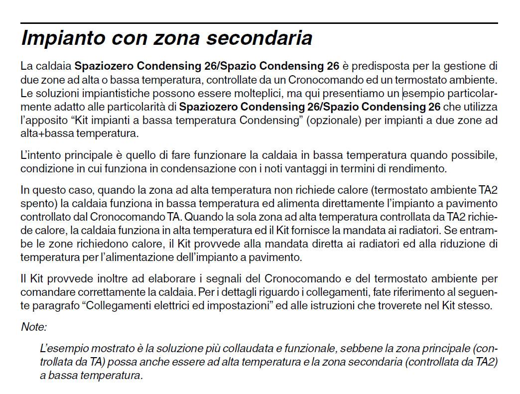 undertherain Inserito: 15 febbraio 2022 Segnala Inserito: 15 febbraio 2022 (modificato) Ciao a tutti. Abbiamo una caldaia Hermann Spaziozero Condensing 26 del 2011 con Spaziozero Solar System e pannello sul tetto per il riscaldamento dell'acqua sanitaria. La caldaia al momento serve il primo piano della nostra abitazione singola purtroppo con un classico impianto a radiatori in alluminio (per cui ad alta temperatura). Dobbiamo terminare il piano relativo alla mansarda e vorremmo dotarlo però di un impianto di riscaldamento a pavimento classico. Leggendo sul libretto della caldaia apprendo che è possibile acquistare un kit denominato "Hermann kit impianti bassa temperatura condensing" (che dovrebbe avere codice A00350007: https://produkttherm.hu/wp-content/uploads/2018/10/085004225_000-Kit-a-BT-condensing.pdf), cui va abbinato Hermann kit per impianti a zone Spazio/Spaziozero (codice A00410004: https://www.ebay.it/itm/265068534501) che permette di far gestire alla caldaia due impianti separati e viene consigliato di impostare come primario quello a bassa temperatura e come secondario quello ad alta temperatura per avere maggior risparmio. Da quanto ho capito, utilizzando questo kit l'impianto ad alta temperatura (a radiatori) non fa richiesta, la caldaia funzionerebbe automaticamente in bassa temperatura (abbassando automaticamente la temperatura), mentre con i 2 impianti che fanno richiesta contemporanea ovviamente la caldaia alzerebbe la temperatura e l'acqua che arriva all'impianto a pavimento sarebbe raffreddata da un miscelatore (con acqua fredda) presente nel kit stesso. Dopo aver contattato Hermann ho capito che non danno alcun tipo di informazione, mi hanno semplicemente girato il numero di un centro di assistenza (leggi idraulico...) della mia zona che mi ha spiegato che purtroppo dopo tutti questi anni tale kit non è più disponibile ma che ne possiamo usare uno di altra marca (tipo Caleffi ed altre) oppure che il mio idraulico potrà "autocostruiserlo". La cosa brutta, purtroppo, è che quando l'idraulico ha realizzato l'impianto ha fatto uscire dalla caldaia 2 tubazioni dell'acqua (andata e ritorno) che si sdoppiano poi all'interno di un muro interno al primo piano dell'abitazione (dove è posizionata la caldaia) e vanno a servire per un lato l'impianto al primo piano ad alta temperatura e per il secondo corrono fino alla mansarda ed attualmente non sono collegate a nulla. Per utilizzare, quindi, un kit del genere senza rompere nessun muro al primo piano, da quanto ho capito, purtroppo, servirebbe portare le 2 tubazioni che escono dalla caldaia direttamente al piano di sopra dove per esigenze di spazio vorremmo mettere tale kit facendo poi uscire dallo stesso le 2 tubazioni che tornano al piano di sotto che si collegheranno all'impianto ad alta temperatura e le 2 tubazioni che saranno usate per servire il nuovo impianto a pavimento della mansarda a bassa temperatura. Dato che preferisco SEMPRE, per OGNI COSA, capire un attimo come funziona il tutto prima di affidarmi a mani basse ad un professionista che magari non mi fa realmente un lavoro ad hoc o comunque non esattamente quello che cerco, sono qua a chiedervi: 1) Mi confermate che è possibile reperire/autocostruire un kit del genere (non di marca Hermann) che MI GARANTISCA però che quando funziona solamente l'impianto a pavimento la caldaia funzioni a bassa temperatura e che si alzi solamente quando entra in funzione solo od anche l'impianto ad alta temperatura? In pratica da quanto ho capito (se ho capito bene...) quello che "comanda" davvero la caldaia è il kit per impianti a zone Spazio/Spaziozero (codice A00410004) che è in pratica una banale schedina da 50€ che si collega via bus alla caldaia e che da la possibilità di avere 2 uscite separate per la gestione di 2 zone separate (cosa che non è possibile senza). 2) Se invece di installare un kit del genere lasciassimo funzionare sempre e comunque la caldaia ad alta temperatura andando continuamente a raffreddare l'acqua per l'impianto a pavimento con un semplice miscelatore, quanto cambierebbe il consumo? Capisco che serve un termotecnico, etc., ma a spanne faccio bene a pensare che fatto 100 il consumo dell'attuale primo piano ad alta temperatura se facessimo un secondo piano ad alta temperatura arriveremmo ad un 180, se facessimo un impianto a pavimento semplicemente miscelando l'acqua (caldaia funzionante sempre ad alta temperatura) arriveremmo magari ad un 160 e se invece installassimo un kit come descritto potremmo arrivare magari ad un, che so... 120? 3) Installando, quindi, la schedina con codice A00410004 lasceremo collegato il cronocomando attuale originale Hermann (che oltre a fungere da termostato permette tutte le regolazioni della caldaia) alla caldaia a gestione dell'impianto a pavimento, mentre al nuovo kit che gestirà le temperature per le due zone andremo a collegare un termostato di tipo domotico (tipo Tado o Netatmo) per gestire l'attuale vecchio impianto ad alta temperatura a radiatori con relative valvole domotiche, in modo da accendere davvero solamente i radiatori che servono. Mi scuso davvero per la lunghezza del mio post, ma vorrei che fosse chiaro tutto quanto. Ringrazio quanti mi vorranno dare una mano. Grazie! Modificato: 15 febbraio 2022 da undertherain