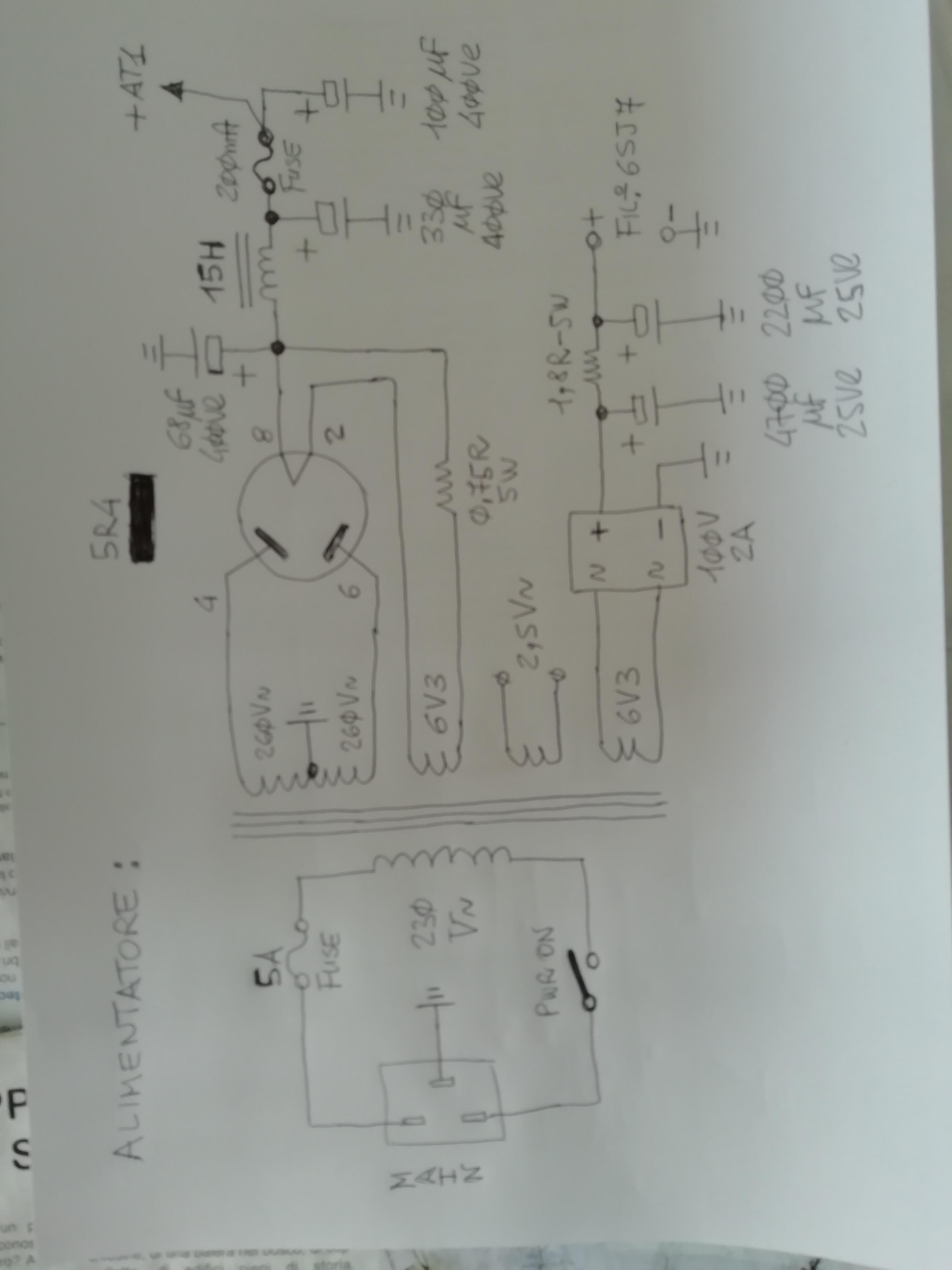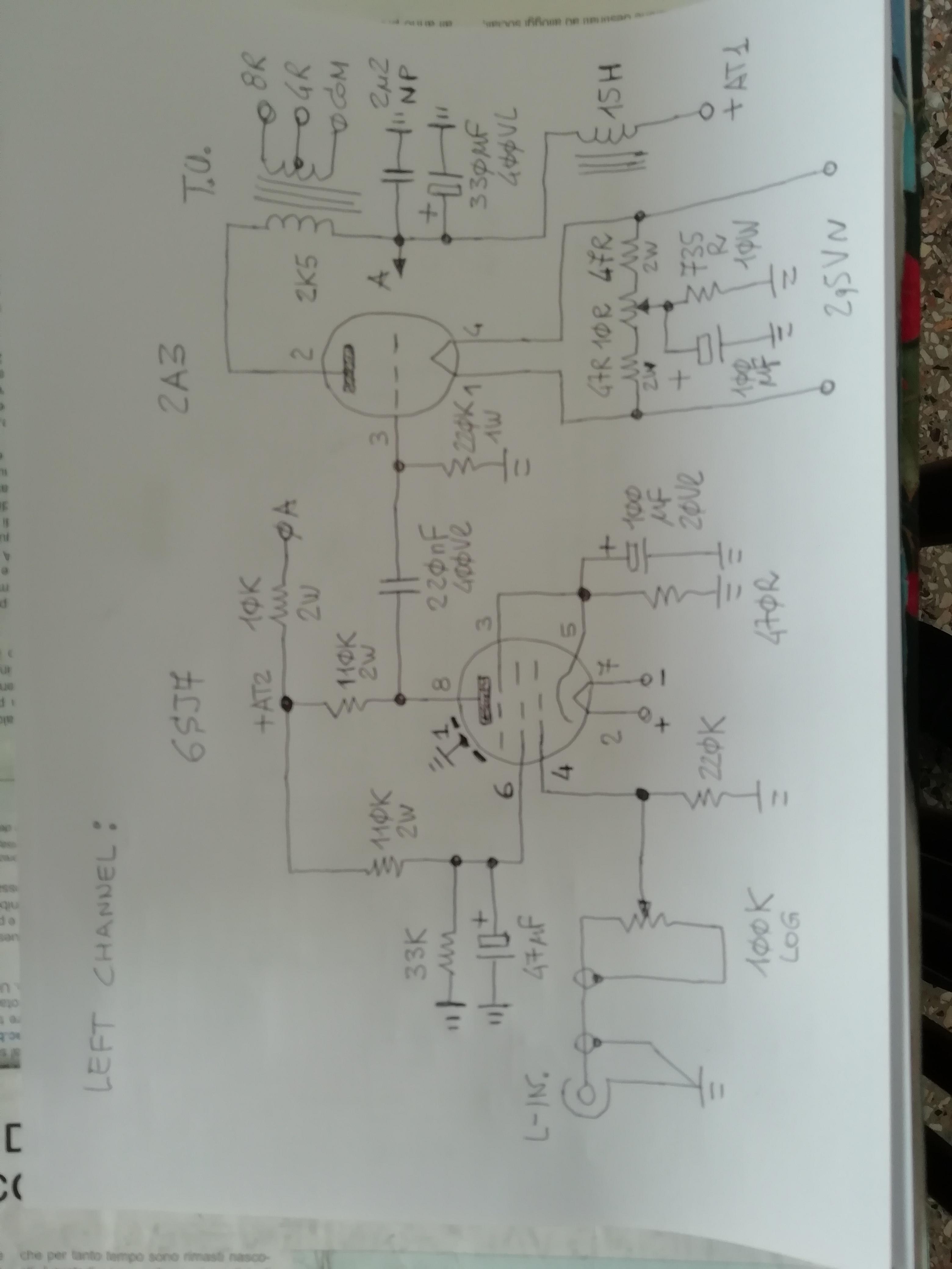 REDCAT2 Inserita: 28 febbraio 2022 Autore Segnala Inserita: 28 febbraio 2022 44 minuti fa, venue2 ha scritto: magari se posti lo schema, ripeto non abbiamo la sfera di cristallo. Ad averlo lo schema ... Non ho lo schema è un amplificatore amatoriale, fatto bene ma non industrializzato. Ad ogni modo il circuito delle finali è classico: anodo collegato al primario del trasformatore di uscita che prende la tensione anodica da un pi-greco formato da una impedenza e due condensatori elettrolitici verso massa, griglia con resistenza da 220K verso massa e condensatore di accoppiamento verso l'anodo della valvola pilota, filamento alimentato in alternata a 2,5 Vac connesso anche agli estremi di un potenziometro da 100 ohm. Il cursore del potenziometro è connesso ad una resistenza da 735 ohm con in parallelo un condensatore da 100 uF - 160 VL connessi a massa per chiudere il circuito anodico. Come ho scritto la tensione anodica all'ingresso del primario del trasformatore di uscita è pulita, ma sull'anodo della 2A3 c'è una tensione di 10 Vpp a 50 Hz, anche collegando a massa la griglia della 2A3.
