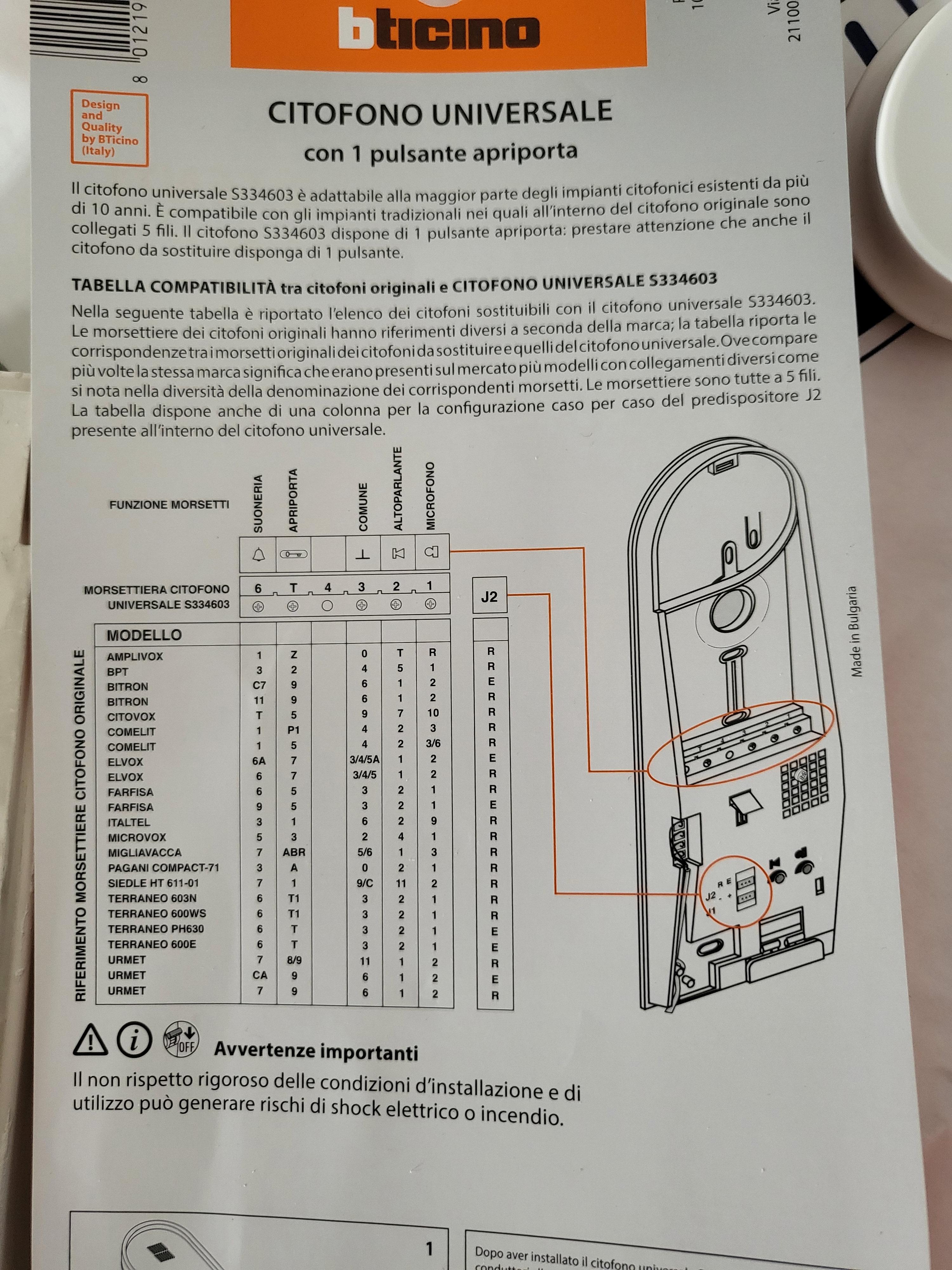 AndreaPav Inserito: 17 aprile 2022 Segnala Inserito: 17 aprile 2022 Buon giorno, avrei bisogno dell'aiuto di qualcuno più esperto di me. A casa avevo un vecchio citofono Terraneo 334002 che ha smesso di funzionare e, visto che è fuori produzione, mi hanno venduto un bticino universale. Ho fatto i collegamenti come da schema che allego, ma non funziona ne l'apri porta, ne la suoneria. Ho provato anche le possibili combinazioni ma non riesco a risolvere. Qualcuno ha una idea? Grazie Ovviamente il filo scollegato alla posizione 6 è per farvi vedere che della suoneria non sono sicuro. Sono sicuro invece di T, che però non apre.