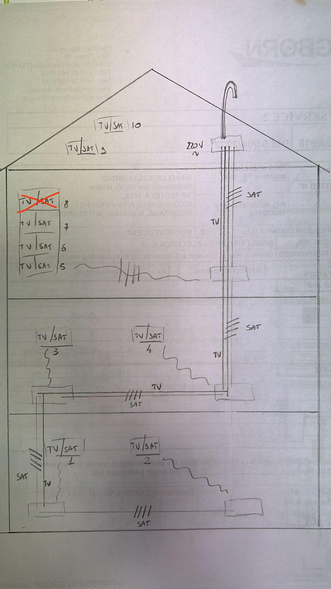 nikoandre95 Inserito: 19 aprile 2022 Segnala Inserito: 19 aprile 2022 Salve come da titolo devo fare un nuovo impianto TV e Satellite su casa appena ristrutturata che ha un nuovo impianto elettrico e predisposizioni tv sat. La casa è composta da piano terra, primo piano e secondo piano con un soppalco. La prima scatola di derivazione dell'impianto tv sat si trova sul soppalco, proprio sotto il palo dell'antenna. Nel soppalco ci sono due tv antenna e due sat, al secondo piano 3 attacchi tv e 3 sat, al primo piano 2 tv e 2 sat, infine al piano terra 2 tv e 2 sat. Mi potreste indicare tutto il materiale che occorre per effettuare l'impianto esclusi i cavi che già posseggo? Vorrei predisporre per il futuro anche Sky. Grazie