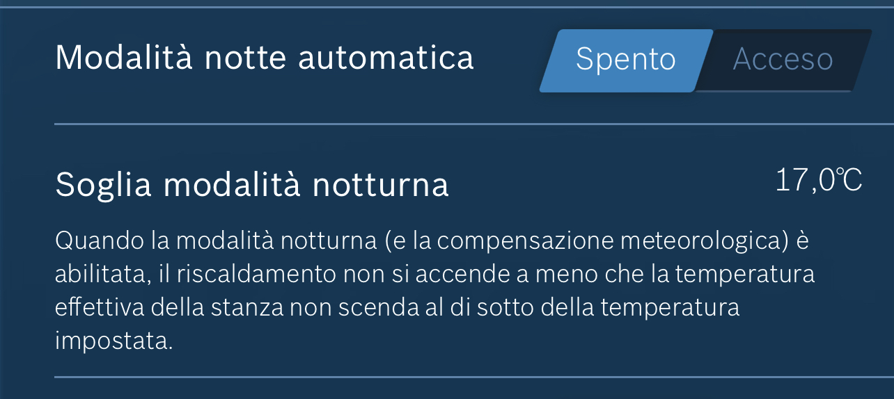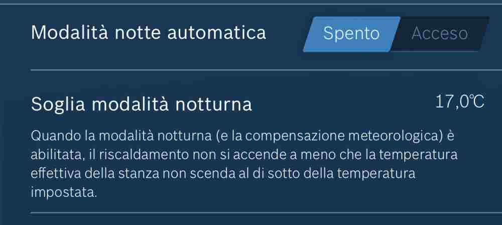 bruceas Inserito: 3 novembre 2022 Segnala Inserito: 3 novembre 2022 Ciao, ho una caldaia Bosch Condens 2300 con un termostato CT200 e l'app Easycontrol. Ho dei dubbi sulla configurazione e sul funzionamento: 1) (la più grave) Controllo dipendente dal meteo. Se lo attivo, anche se ho impostato una temperatura desiderata minore di oltre 4 gradi rispetto alla temperatura rilevata, la pompa si mette in funzione. Solo la pompa, non la fiamma. La cosa è fastidiosa perchè si sente il rumore dell'acqua che circola nelle tubature e non credo che faccia neanche bene alla pompa funzionare in continuo senza nessuna necessità. Cercando su forum esteri, ho trovato un problema simile con un termostato più vecchio del CT200 ed un particolare firmware. Sembrerebbe che la caldaia faccia circolare l'acqua per sapere qual'è la temperatura di ritorno della stessa. Adesso non mi serve il riscaldamento, per cui disattivo il controllo dipendente dal meteo e dopo qualche minuto la pompa si ferma. Ciò è anche verificabile con HomeAssistant dove il parametro "actual heating pump modulation" passa da 0% a 100% quando l'opzione è attiva. 2) Modalità notte automatica - Soglia modalità notturna. Come funzionano? C'è una relazione con l'orario o solo con la temperatura? E la temperatura a cosa si riferisce? Quella in casa o quella esterna? Il riscaldamento si attiva oltre o al di sotto di tale temperatura? 3) Modalità estiva automatica - Soglia di scadenza estiva. Stesse domande del punto 2. Parametri WDC 4) Influenza della stanza. Tra bassa e alta cosa cambia? Su alta la richiesta di calore è più reattiva col rischio di oscillazioni maggiori? Quando poi utilizzerò realmente il riscaldamento, vedremo se sorgeranno altri dubbi. P.S. Riguardo il punto 1), cercando in rete ho trovato questo sulle recensioni Amazon DE del CT200: Quello che all'inizio non sapevo era che i controlli del riscaldamento "a temperatura esterna" si basano sul fatto che l'acqua di riscaldamento viene costantemente fatta circolare. Grazie alla misurazione permanente della portata, le deviazioni dalla temperatura ambiente vengono rilevate più rapidamente e (quindi in teoria) il riscaldamento è più efficiente. Bisogna quindi considerare se questo tipo di controllo del riscaldamento sia davvero più conveniente, dal momento che in molti bagni termali sono installate pompe di circolazione a bassissimo rendimento. Non sono da sottovalutare nemmeno i 40-80 watt di funzionamento continuo della pompa durante l'intero periodo di riscaldamento. Puoi scambiare solo il gas con i costi dell'elettricità. Tuttavia, la conformità residenziale è maggiore perché la temperatura è meglio controllata. Che ne pensate? Conviene lasciarlo attivo? Di notte la pompa si ferma? C'è qualche altro modo per fermarla?