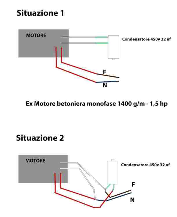 TinoAle Inserita: 10 giugno 2025 Segnala Inserita: 10 giugno 2025 (modificato) Salve, approfitto della discussione, sempre se posso, per chiedere spiegazioni su un motore monofase di una vecchia betoniera da riutilizare come motore per un nastro. In poche parole il motore ha 4 fili che escono dal suo interno, 2 rossi e 2 bianchi. Ai capi dei fili bianchi c'era un condensatore, da sostituire (450v 32 o 35 uf non si capiva bene xè la scritta era rovinata) perchè a quanto detto esausto. Il muratore mi ha detto che basta collegare neutro ad un filo rosso, la fase all'altro filo rosso, ricollegare il nuovo condensatore ed il motore farà il suo dovere. Dai video visti su youtube ho notato che nessuno collega così un motore monofase come descritto in precedenza ma lo fanno in modo diverso. Nella foto qui sotto ho rappresentato (ho cercato di fare del mio meglio con Paint) il collegamento come mi hanno detto di fare "Situazione 1" ed il collegamento che secondo me e secondo i video andrebbe fatto "Situazione 2". Poi vorrei capire a cosa serve il condensatore, che funzione ha, alcuni dicono che serve per lo spunto iniziale altri che serve a far funzionare il motore. Ah dimenticavo di dire che con un multimetro ho misurato gli ohm tra i 2 fili rossi 2,5 ohm e tra i 2 fili bianchi 8,7 ohm. Grazie per il vostro tempo. Modificato: 10 giugno 2025 da TinoAle