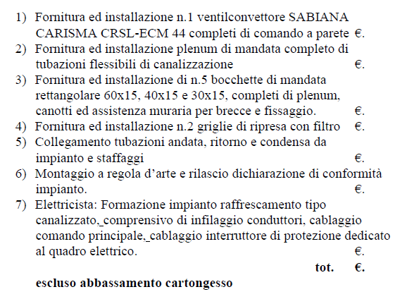 Simone Baldini Inserita: 29 maggio 2023 Segnala Inserita: 29 maggio 2023 (modificato) La pompa di calore credo esista gia e non sia nel preventivo. Nel caso i 6800 euro mi sembrano un pochettino alti, cioè tieni conto: - una macchina del genere la paghi sulle 1000 euro - tubi flessibili e penum mediamente calcola altri 300 per ogni bocchetta n.5 x 300 euro = 1500euro - collegamenti elettrici 300 euro - collegamenti idraulici 600 euro - mandodopera 1200 euro Totale 4600 euro + IVA stando dalla parte della ragione. Poi non so se ci sono altre attività che non sono menzionate e che fanno andare 6800 euro i costi. Modificato: 29 maggio 2023 da Simone Baldini