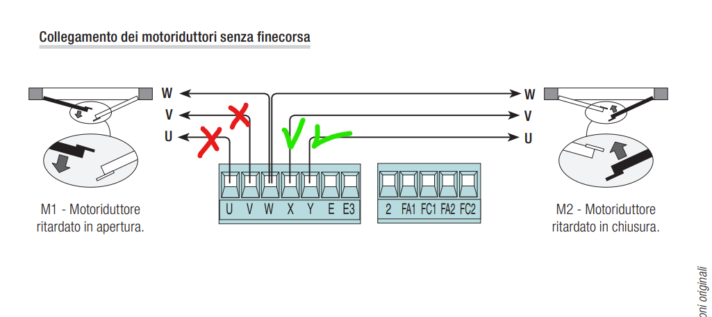 ROBY 73 Inserita: 3 luglio 2023 Segnala Inserita: 3 luglio 2023 6 ore fa, Robi70 ha scritto: misurando con il tester ai morsetti U e V (diretti a M1) , tranne la prima volta dopo aver tolto e rimesso la luce e dopo che M1 arriva a completa apertura, non c'è più segno di vita ... 0 totale , mentre ai morsetti X e Y regolare passaggio di corrente . A parte il fatto che NON devi misurare tra U e V o tra X e Y, ma bensì tra: W e U per M1; W e V per M1 ; W e X per M2; W e Y per M2, e la tensione ce l'hai solo al momento che la centrale ha tutti i consensi chiusi. Poi per la tensione corretta bisogna valutarne il senso dio marcia se in apertura o chiusura Sblocca i motori e posta le ante manualmente a metà corsa in modo che i finecorsa non influiscano e vedi se funziona e già che ci sei prima di dare un colpo di START, fai un paio di foto dei motori con i finecorsa a vista e postale. 6 ore fa, Robi70 ha scritto: A questo punto penso che ci sia qualcosa nella centralina ....mi sa che non mi rimane che chiamare il tecnico 😪 Vedi tu, se non te la senti di fare altre prove e/o non hai tempo, valuta il da farsi
