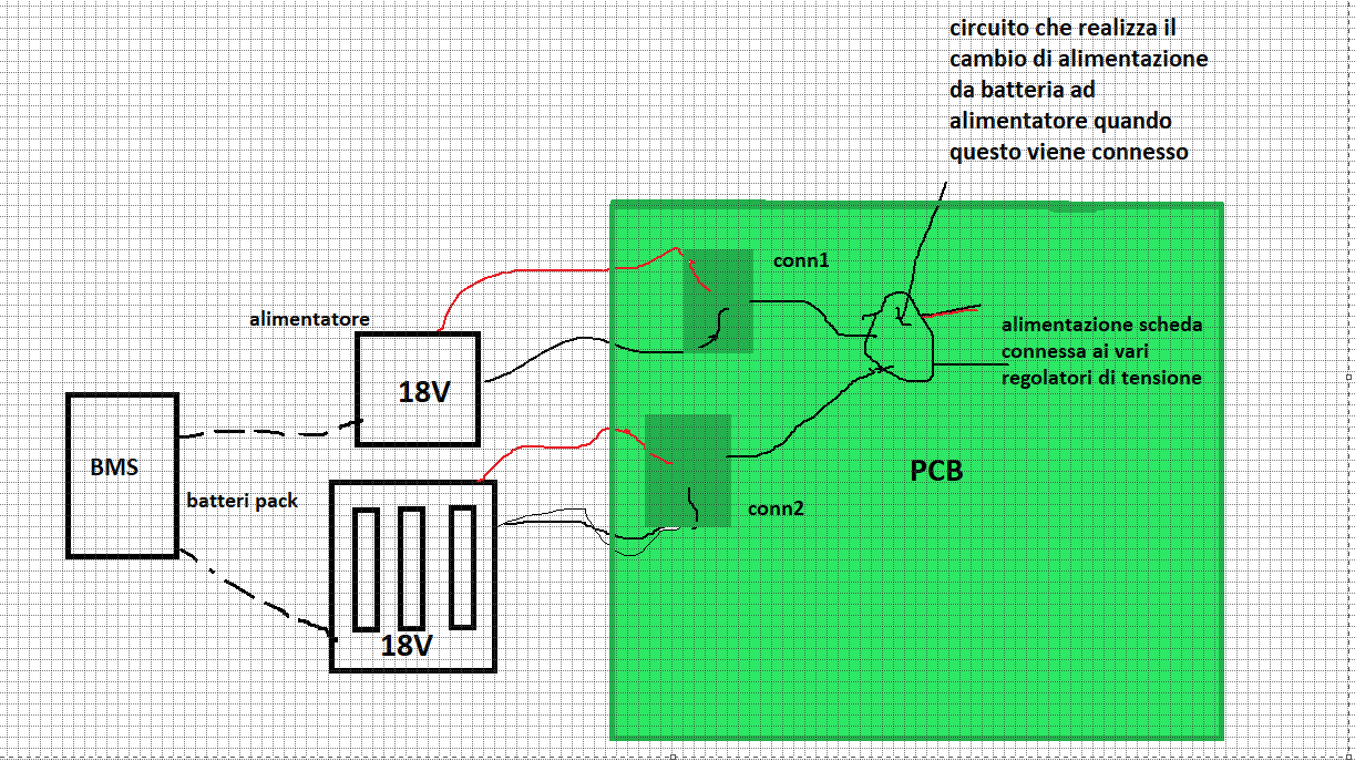 Davide Vergnani Inserita: 12 agosto 2023 Autore Segnala Inserita: 12 agosto 2023 Comunque direi di aver trovato la soluzione giusta su AliExpress, ho intenzione di comprare un BMS ne ho gia visti alcuni che direi essere anche molto economici. Tornato alla parte di switch da batteria ad alimentatore, all'interno del PCB(il BMs è esetreno e a aprte), ho preparato uno schema di principio su cosa vorrei realizzare.