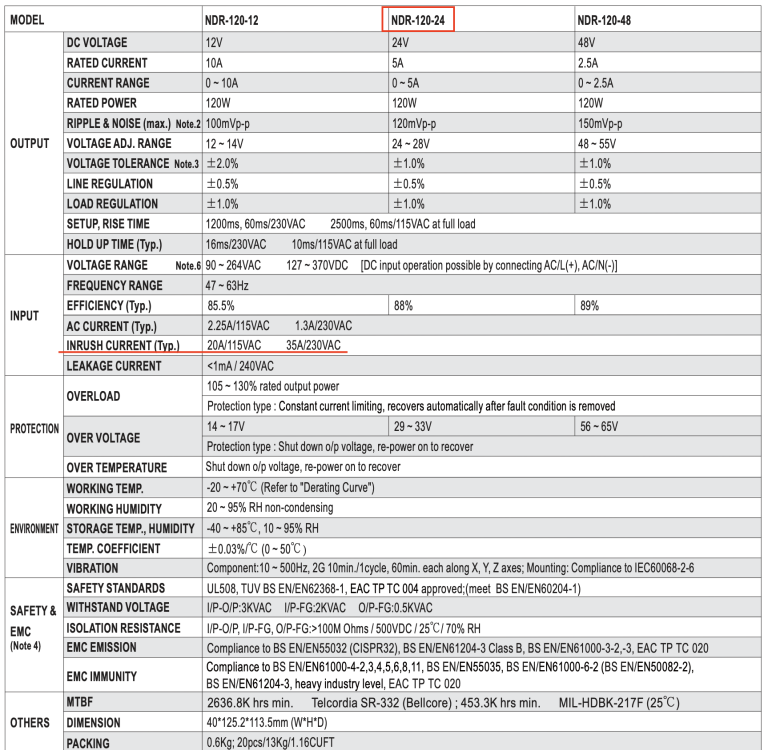 Valetronic Inserita: 26 settembre 2023 Autore Segnala Inserita: 26 settembre 2023 (modificato) Buonasera Livio 7 ore fa, Livio Orsini ha scritto: Fa attenzione, se è un alimentatore Switching la corrente di "inrush" all'accensione può essere molto elevata. Leggi bene le specifiche dell'alimentatore in questione e, nel caso, usa un fusibile ritardato. ho verificato e dal data sheet si evince che l'alimentatore in questione ha una corrente di inrush di 35A a 230VAC; riporto in allegato un estratto delle caratteristiche con evidenziato il modello. questo significa che dovrei inserire prima dell'alimentatore un fusibile di almeno 35A? di che tipologia e dimensioni mi suggeriresti usare? sezione filo tra Fusibile ed alimentatore? 4mm2 o 6mm2?? Grazie Modificato: 26 settembre 2023 da Valetronic