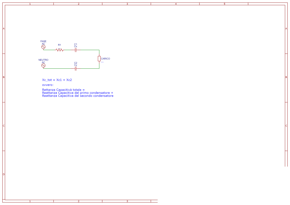 piergius Inserita: 25 settembre 2023 Segnala Inserita: 25 settembre 2023 - Osservando lo Schema, si tratta di una Maglia in cui circola Corrente. Resistore, Condensatori e Carico sono 4 Impedenze poste in Serie, che realizzano un Partitore. - Il Circuito viene utilizzato in Alternata se non è necessario Isolamento Galvanico ! ! (Praticamente la Capacità posta in serie limita la Corrente che può circolare sul Carico.) - Vengono ridotti nettamente la Potenza dissipata e il Fattore di Potenza , rispetto al Partitore Resistivo . - Lo Schema che hai proposto, se dotato di 2 Condensatori uguali, porta il Carico a lavorare ad una Tensione intorno ai 115Volt ~ verso Terra ! ! Quindi riduce parzialmente la Tensione Alternata presente sui Componenti del Carico, ma non li isola da Terra . - Tendenzialmente è più indicato per Apparecchi dotati di Spina Europlug, per natura soggetti ad Inversione di Polarità . - Invece, nei Cronotermostati o nelle Lampadine E14 o E27 ne mettono solo 1 lato Fase . Così la Tensione Alternata sugli altri Componenti può ridursi a qualche decina di Volt verso Terra . (A patto che Fase e Neutro siano giusti ). - Buona giornata !