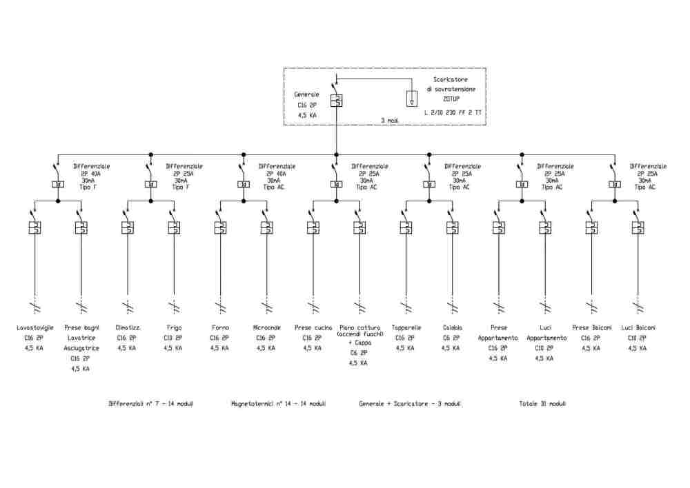 Termico Inserita: 31 ottobre 2023 Autore Segnala Inserita: 31 ottobre 2023 7 ore fa, reka ha scritto: perchè alcuni puri da 25 e altri da 40? Salve reka, ho messo quelli da 40 A perché a valle ci sono due magnetotermici da 16 A. 7 ore fa, reka ha scritto: C16 come generale sicuro? e dove è il contatore? è un errore di trascrizione ma il valore corretto è 32 A, il contatore è nel locale contatori, nell'androne del palazzo, e l'appartamento è al terzo piano. 7 ore fa, reka ha scritto: io userei tipo F anche per altre prese.. a quali prese ti riferisci, prese cucina - prese appartamento - prese balconi