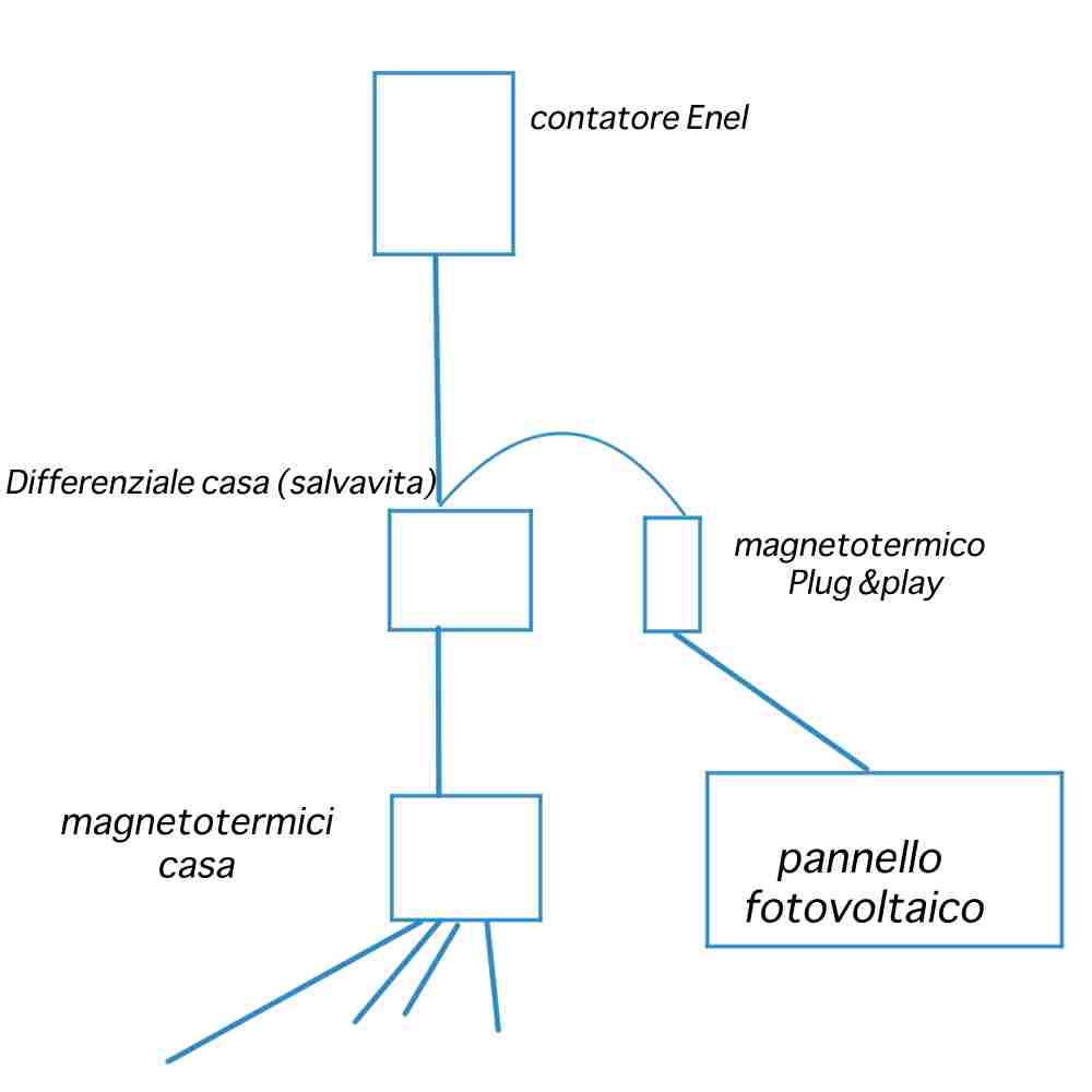 Pepe85 Inserito: 4 novembre 2023 Segnala Inserito: 4 novembre 2023 Buongiorno a tutti, Mi chiamo Giuseppe e sono un appassionato a livello amatoriale sia di fotovoltaico sia di elettrica/elettronica. Ho un impianto fotovoltaico ad isola autocostruito da ormai due anni, circa 1KW installato con inverter Victron Smart Phoenix 24/2000, regolatore Western co da 24 V e pacco batterie al piombo di un carrello elevatore, circa 24 V 350 Ah. Volevo chiedere un consiglio a chi è sicuramente più esperto di me. A breve vorrei provare a montare un piccolo impianto plug&play (quindi sotto i 350W) Lo stesso manuale dell'Enel che viene fornito insieme ai suoi pannelli da 350W non è chiarissimo per quanto riguarda la questione della "presa dedicata" Spulciando su questo forum e su altri, e chiedendo ad un amico che fa l'elettricista di lavoro (ma che non si occupa di impianti fotovoltaici) mi è parso di capire che il magnetotermico (o MG differenziale, se uno vuole mettere quello) andrebbe messo in parallelo all'entrata del salvavita. Premesso che in casa io non ho un "dispositivo Generale" per interrompere la corrente a tutta la casa, ed avendo tutto a breve distanza dal contatore (quadro generale con salvavita e i vari magnetotermici) mi sembra di aver capito che dovrei montare la presa dedicata come ho messo nello schema che allego sotto. Qualcuno con più esperienza mi può confermare che è giusto, oppure dirmi dove ho sbagliato? Grazie in anticipo a tutti. Giuseppe
