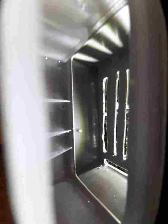 Foto dall'imboccatura del condotto poco dopo aver montato il pezzo nuovo e con luce all'interno della lavastoviglie