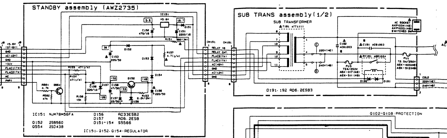 Ctec Inserita: 27 novembre 2023 Segnala Inserita: 27 novembre 2023 13 minuti fa, Harleybianca ha scritto: se stacco il connettore grigio che si vede in foto , il rumore va via ma non credo significhi niente Invece si, perché tramite quel connettore viene attivato o meno il relè. Qui la parte di schema interessato: Come si vede, la bobina del relè (che accende poi il trasformatore di potenza dell'ampli) è comandata dai pin 1 e 2 del connettore grigio. Questi vanno alla scheda StandBy e in particolare il filo 2 a una alimentazione di 38V tramite una resistenza R151, e il pin 1 va al collettore del transistor Q554, che quando attivato, mette il pin a massa. Se quindi lo senti ticchettare, è lui che accende/spegne in continuazione il relè (e il trasformatore di potenza). Ovviamente ciò non va bene. La prima cosa da fare è verificare che, in stand-by, non ci sia assolutamente tensione (o molto bassa) sul pin 9 del connettore a sx della scheda StandBy. Se c'è tensione, anche saltuariamente, in stand-by, controllare anche il Q551 sulla scheda AF Assembly Chiaramente ci vuole un po' di preparazione elettronica per risalire al difetto...