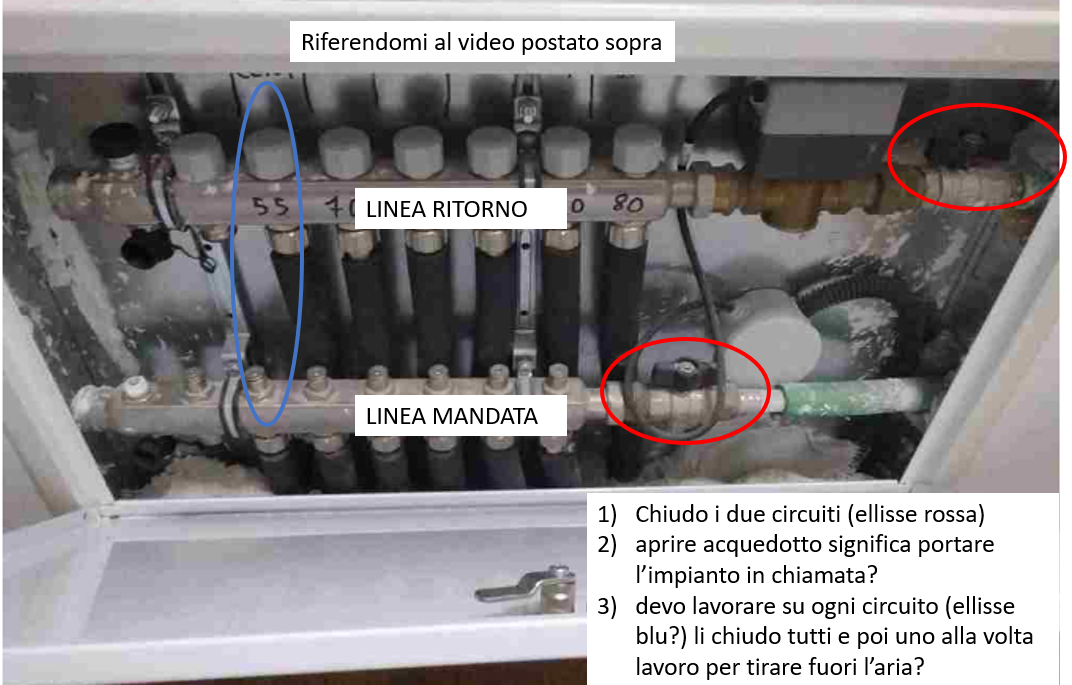 reka Inserita: 30 dicembre 2023 Segnala Inserita: 30 dicembre 2023 di solito lo hanno ma nel tuo caso, essendo un primo piano, immagino che il punto più alto sia prorio quel collettore dove trovi aria. a me sembra strano che ci sia lo sfiato nel collettore in arrivo che è più in basso. ma in quello sopra, sotto il volantino non c'è uno sfiato? in questo caso io, a impianto spento e questo collettore aperto, andrei a caricare acqua dalla caldaia, nel momento che comincia ad uscire acqua dallo sfiato lo chiuderei e aspetterei che la pressione salga. chiaramente meglio essere in due..