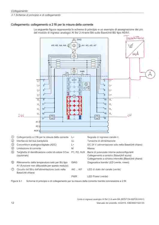 manuelflorio01 Inserito: 27 febbraio 2024 Segnala Inserito: 27 febbraio 2024 Buonasera a tutti, ho problemi nel collegare l'ingresso analogico nel modulo sopra elencato, ho visto anche lo schema di collegamento che fornisce siemens, ma eseguendo quel collegamento e osservando un amperometro, collegato in serie, mi arrivano 50 mA. Vi allego lo schema siemens del prodotto 6ES7 134-6GF00-0AA1 e il collegamento che ho eseguito io. Grazie in anticipo