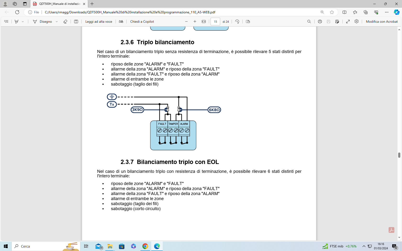 renato1961 Inserita: 12 marzo 2024 Autore Segnala Inserita: 12 marzo 2024 Grazie Panter,io ho fatto il triplo bilanciamento come da schema con 2 resistenze però se guardo bene anche lo schema di configurazione in allegato la zona 1 risulta essere la zona di fault e non quella di allarme
