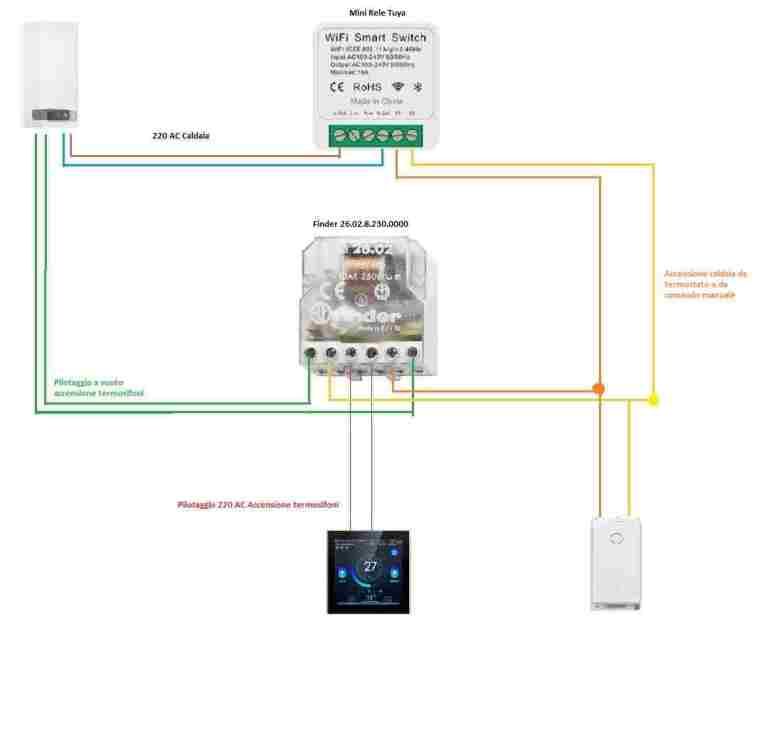 Feedsteel Inserito: 8 aprile 2024 Segnala Inserito: 8 aprile 2024 Buongiorno a tutti, nella casa che ho appena acquistato ho trovato una caldaia ad accumulo che per il momento non volevo cambiare. Ho istallato un termostato wi fi ed un rele sempre wi fi comandabile da telefono o Alexa in maniera tale da tenere spenta la caldaia ed accenderla solo a necessità. Tutto mi funziona ho però un problema, quando a caldaia spenta do l'impulso dal termostato questo fa partire la caldaia regolarmente ed attiva la valvola a tre vie per i termosifoni. Al momento però che spengo il termostato la caldaia mi rimane accesa devo riaccendere il termostato e rispengerlo a quel punto la caldaia va in off. Riporto l'istallazione che ho fatto ed i componenti, mi sembra un impianto semplice ma forse ho sbagliato la scelta del relè o forse è la sezione dei fili troppo grande che non da un segnale corretto al rele wi fi tuya. Grazie per qualsiasi info.
