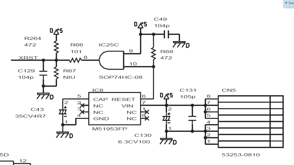 Fulcro Inserita: 22 maggio 2024 Autore Segnala Inserita: 22 maggio 2024 (modificato) Il 20/05/2024 alle 08:18 , Ctec ha scritto: Il circuito di reset è questo: Il segnale XRST deve rimanere a 0 all'accensione per un certo tempo, determinato da IC8/C13, e poi passare a 1 liberando il reset. R68 e R261 (eccola lì) sono dei pull-up, il buffer che eroga corrente sulla linea è IC25C. In primis, se puoi, stacca il pin 6 di IC8, e il segnale XRST dovrebbe andare a 1 praticamente subito. Fregatene al momento se il sistema non si resetta correttamente. Questo vorrebbe dire che il buffer IC25C sta facendo il suo lavoro. Se i pin 9 e 10 di IC25C sono a 1 ma il pin 8 rimane a 0, scollega la R66. Se continua, IC25 è guasto, altrimenti il problema è a valle. Se tutto quanto sopra è corretto, e per esempio il pin 6 di IC8 è sempre a 0, o è guasto o la tensione di alimentazione è troppo bassa (tali integrati fanno anche la sorveglianza dell'alimentazione). Ah, te dici R68 è da 4k7, ma a schema sembra da 1k7 (172), anche se non sarebbe un problema... Ho scoperto perchè non trovavo la R261: in effetti è su un altro circuito (di mute, se non erro), mentre nell'immagine che mostri tu ci sono tutti i 4 tagliati come se fosse 1 (R261 è in realtà R264, le resistenze da 172 sono in realtà 472), da qui i nostri misunderstanding 😄 Qui allego lo screenshot fatto da me, vediamo se appare "rovinato". Nel frattempo, ho staccato il IC25 74HC08, e il segnale di reset compare correttamente al pin 6 del IC8 M51953 (la R66 funziona ancora come pullup): posso concludere solo che IC8 SEMBRA funzionare. Ora pensavo di connettere direttamente il pin6 di IC8 al pad del pin8 di IC25 (a IC staccato, ovviamente) per vedere se le varie CPU ricevono il XRST, sempre che questo si presenti. Sto trascurando qualcosa? Modificato: 22 maggio 2024 da Fulcro