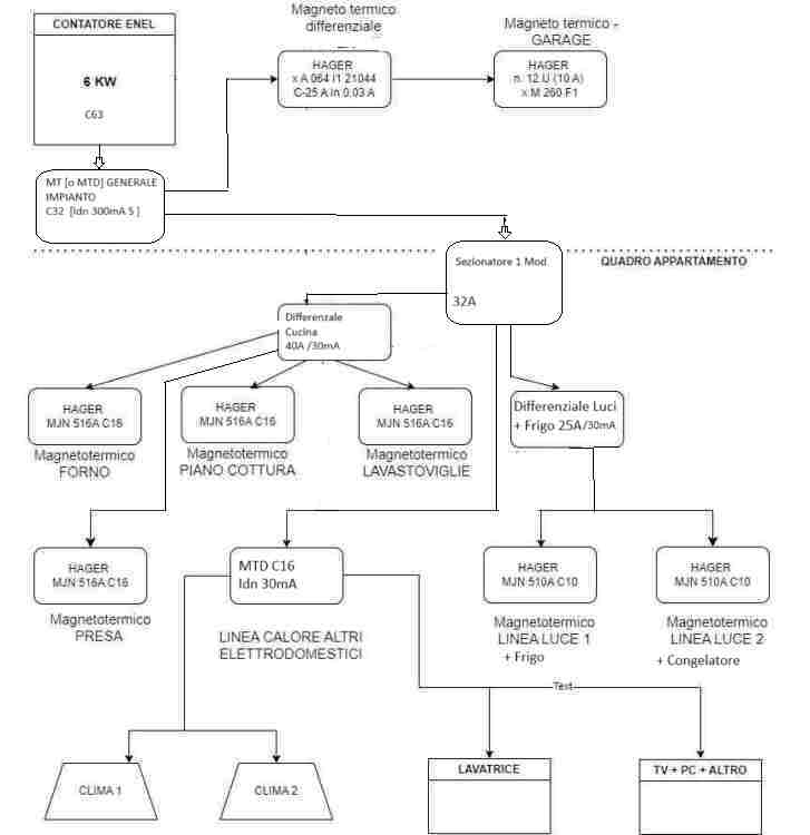 grazie per la risposta. però al quadro non posso aggiungere ma solo sostituire gli esistenti. Se guardi il flow che ho disegnato, la lavatrice è presente ed insieme a PDC aria/aria , pc e tv , sono collegati allo stesso interruttore MT indicato come "LINEA CALORE" .