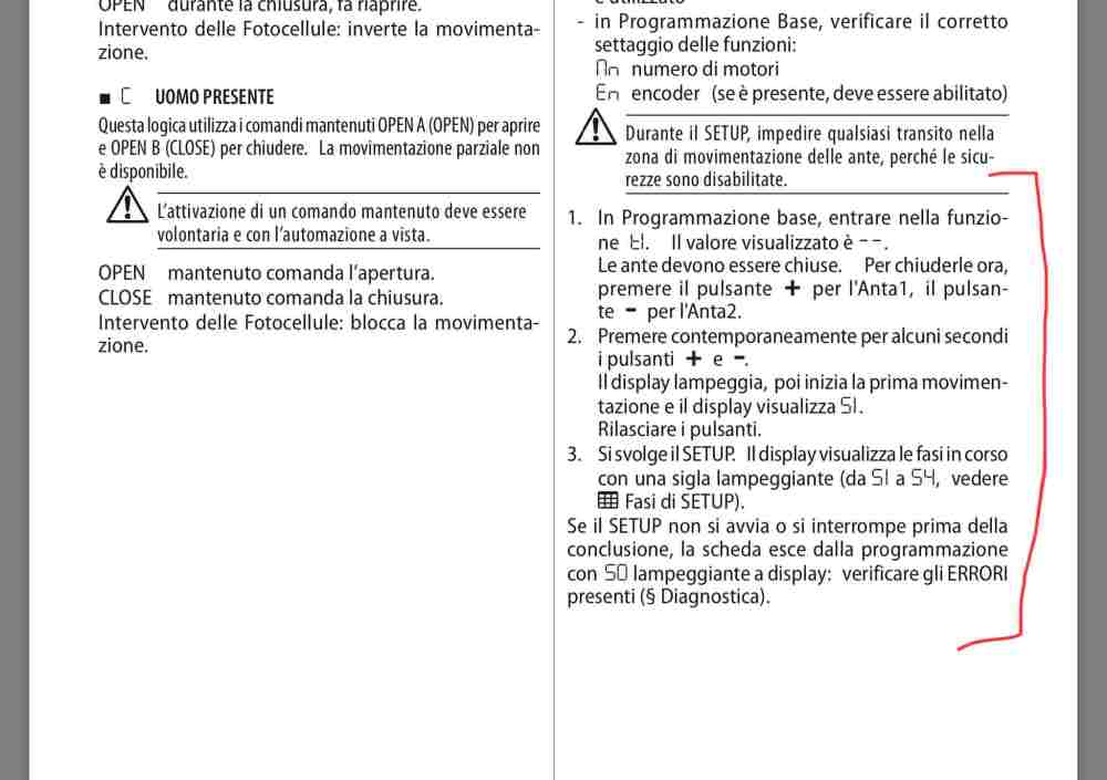 alekeenan Inserita: 25 settembre 2024 Autore Segnala Inserita: 25 settembre 2024 Ciao Roberto Grazie ancora per pazienza e disponibilità. ci ho provato diverse volte ma l’anta si ferma nel punto dove avevo erroneamente premuto poco dopo che compare il SI e poi torna a lampeggiare il 50. ho notato che se imposto Envoder Yes l’anta si ferma e fa da lì non posso più fare nulla, Se imposto Encoder no, l’anta arriva a battuta, ma poi se premo più non succede nulla ed il motore continua a spingere, qjuondi non costretto a staccare la corrente per evitare di bruciare il motore. ho fatto i vari passaggi che dice il manuale ma non ne vengo a capo.. ;-(((( può essere qualche filo da controllare?