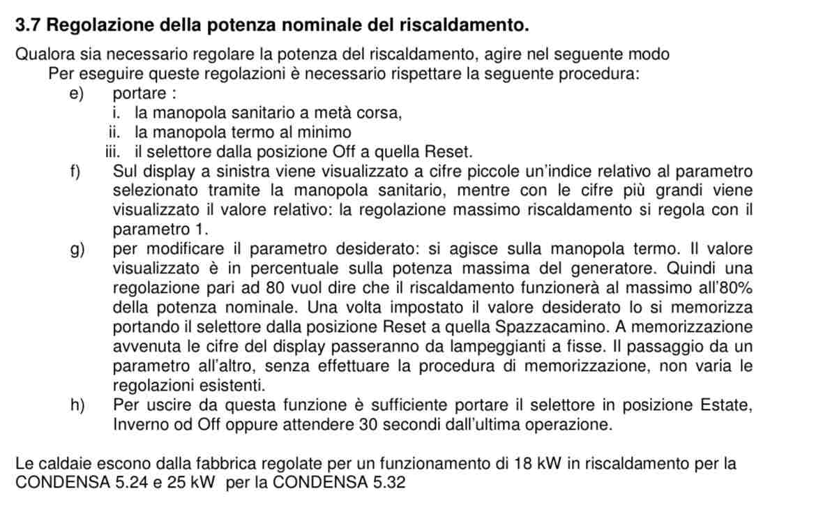 - Anche lui concorda con il fatto che la caldaia é esuberante e ha diminuito la potenza nominale da 45 a 30% (anche se non credo che questo comporti un miglioramento);