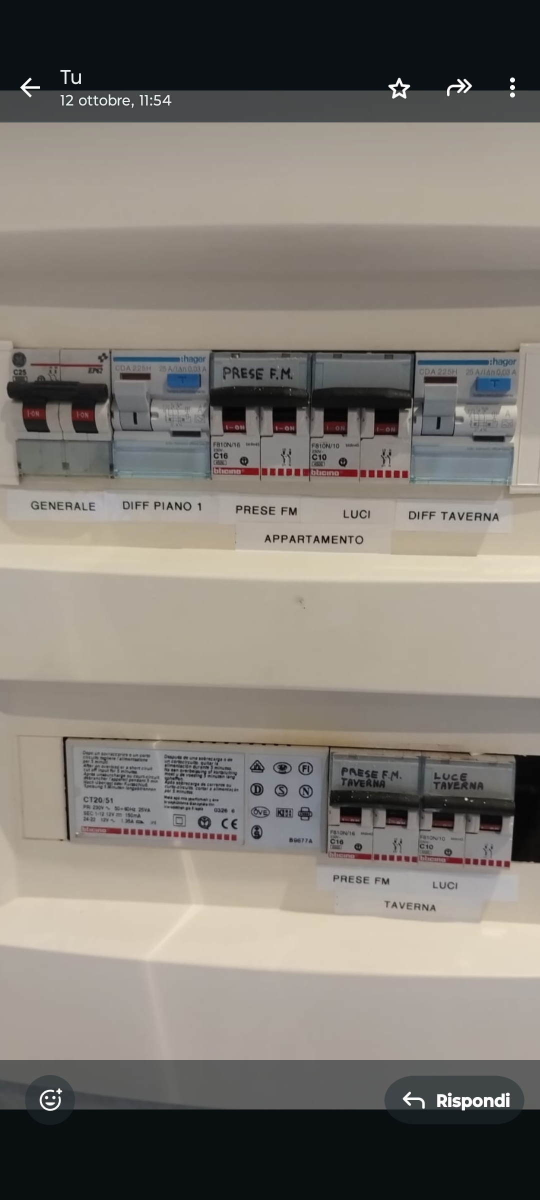 xman80an Inserito: 7 dicembre 2024 Segnala Inserito: 7 dicembre 2024 In garage ho una presa bipasso e un interruttore per la luce, e nelle prime due foto si vedono i cavi che ripartono e credo che vanno nella altra presa e interruttore che ho vicino alla serranda del garage ( ultima foto) Vorrei collegare un asciugatrice a resistenza classe energetica B si quest ultima presa. Sostituiro la bipasso con una schuko. I cavi mi sembrano di dimensioni corrette. Nel centralino ho un c16 per le prese del garage. Come in foto... Dovrei essere tranquillo mettendo la asciugatrice in questo modo?