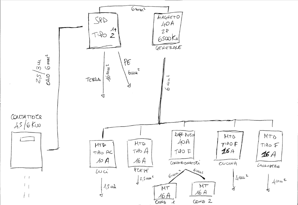 messimo Inserita: 23 gennaio 2025 Segnala Inserita: 23 gennaio 2025 Ciao, aspetta le risposte di chi ne capisce. Io mi permetto solo di dire (vediamo se confermano o meno) che per i condizionatori bastano MT da 10A. Che i cavi che utilizzi come dorsali delle luci e prese devono essere rispettivamente da 2,5 e da 4 mmq. Il cavo che arriva in cucina, sopratutto se hai piano ad induzione, è meglio meterlo da 6 mmq PS: per le luci e le prese ti consiglio i MTD della abb, modulo singolo, che sono di tipo A ciao ciao